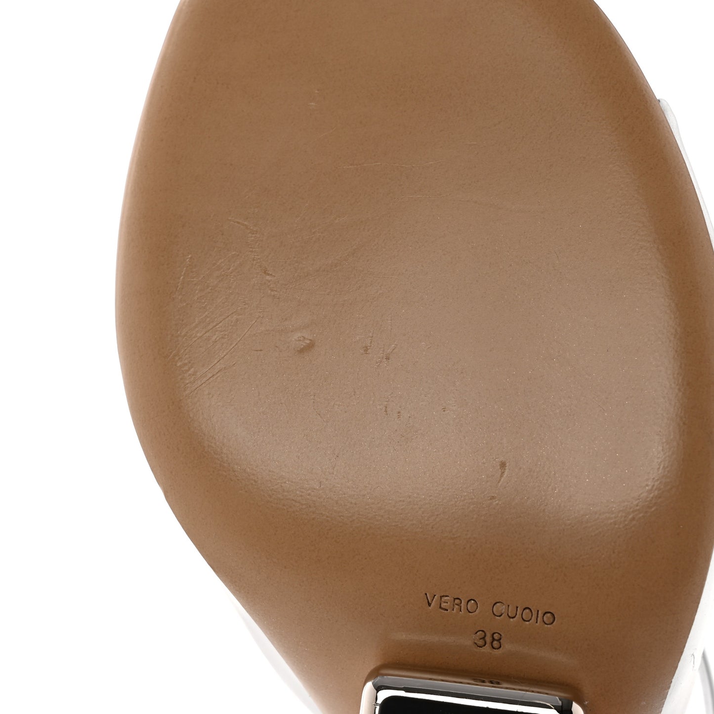 This is an authentic pair of FENDI Calfskin Fendi First 95mm Slide Sandals 38 in Argento. These are stylish sandals are crafted of silver calfskin leather. The gold metal heel has a diagonal F shape with rubber padding underneath. These slide sandals feature a padded lambskin footbed for comfort.