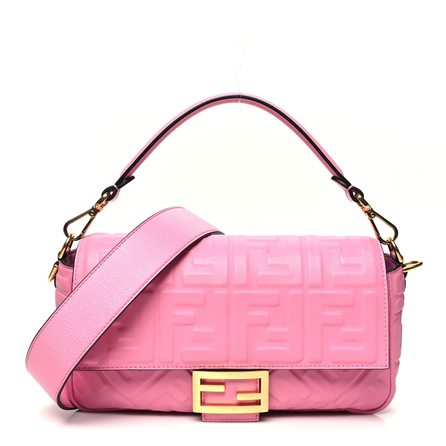 This is an authentic FENDI Nappa FF 1974 Embossed Baguette in Pink. This chic baguette is crafted of Fendi monogram-embossed lambskin leather in pink. The bag features a smooth leather top handle and a matching, optional shoulder strap with polished gold hardware. The crossover flap opens with a prominent magnetic gold FF logo detail to a black fabric interior with a zipper pocket.Follow this item for alerts. Fendi is a registered trademark of Fendi. FASHIONPHILE is not affiliated with Fendi.