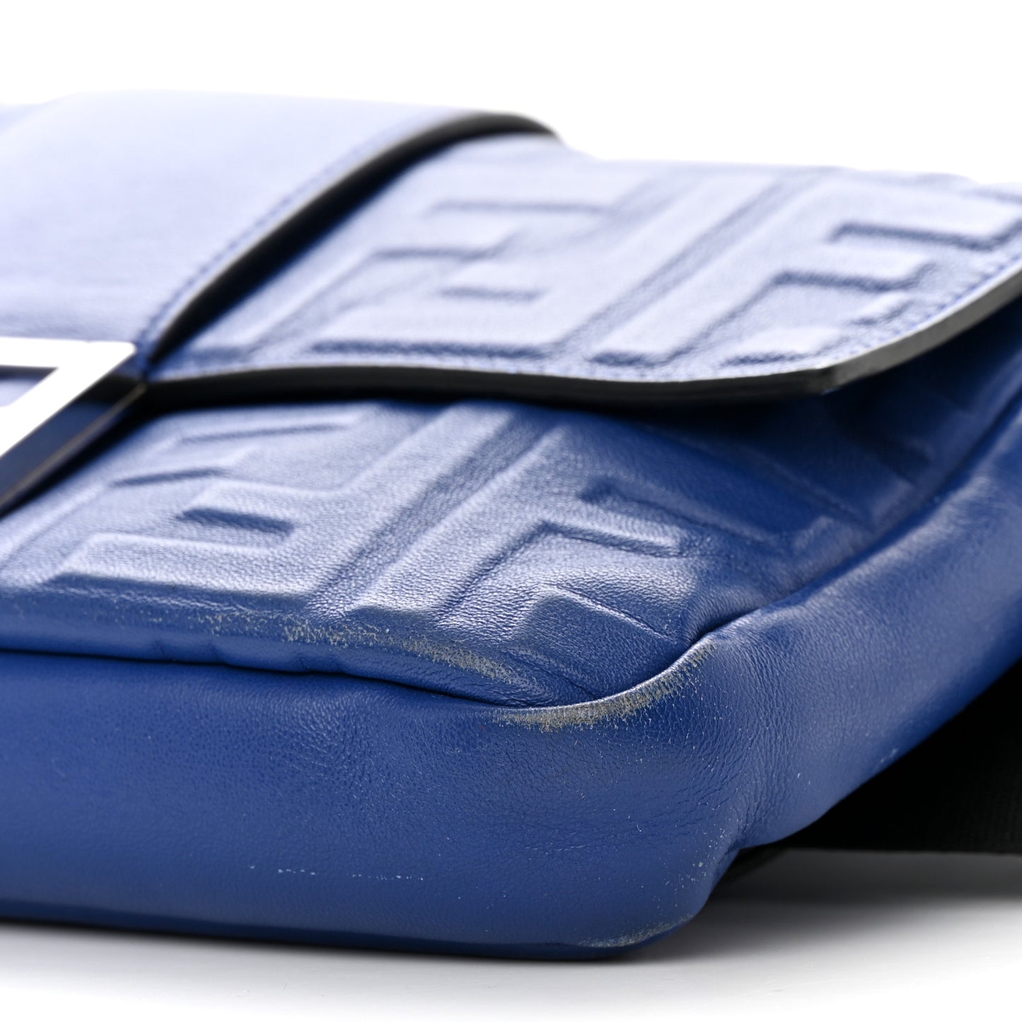 This is an authentic FENDI Nappa FF 1974 Embossed Belt Baguette Bag in Blue Neon. This chic baguette is crafted of Fendi monogram-embossed lambskin leather in blue. The bag features a removable shoulder strap with polished silver hardware and an optional nylon adjustable belt. The crossover flap opens with a prominent magnetic silver FF logo detail to a black fabric interior with a zipper pocket.