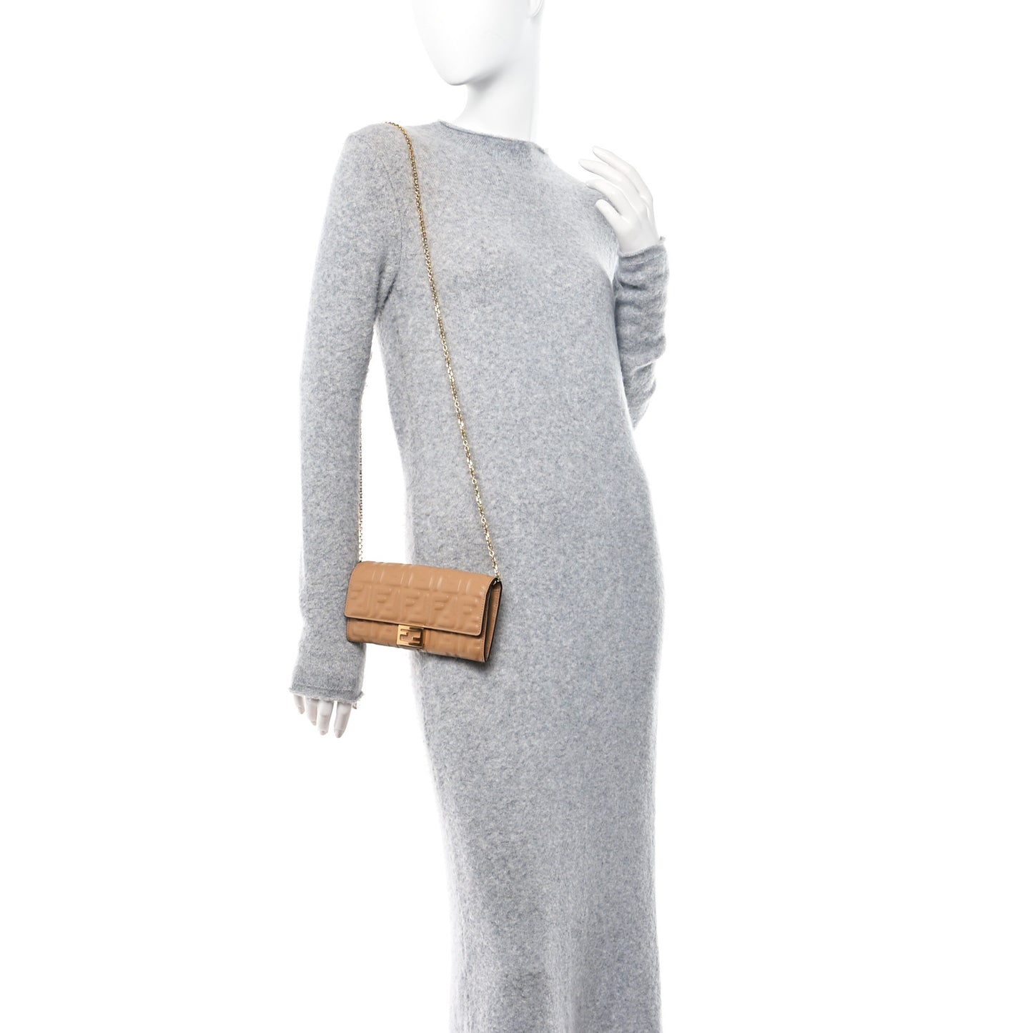 This is an authentic FENDI Nappa Matisse FF Embossed Continental Wallet on Chain in Miele Scuro. This petite wallet on chain is crafted of Fendi FF monogram-embossed lambskin leather in beige. The bag features an optional gold chain-link shoulder strap and a matching gold Fendi FF logo bar on the crossover flap. This opens to a partitioned beige leather interior with card slots, patch pockets, and a middle zipper compartment.Follow this item for alerts. Fendi is a registered trademark of Fendi. FASHIONPHILE is not affiliated with Fendi.