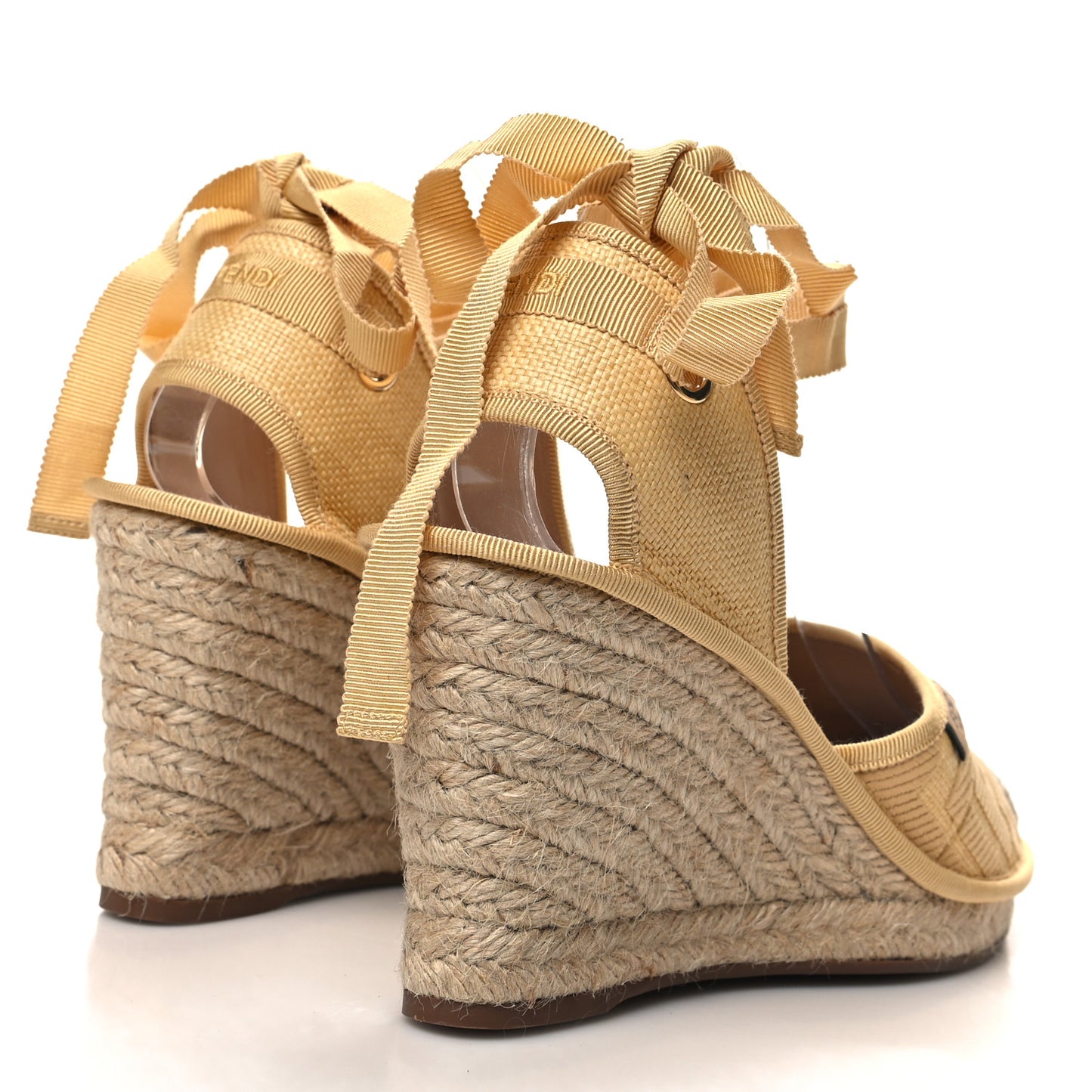 This is an authentic FENDI Rafia FF Embroidered Roma Ankle Wrap Espadrille Wedges size 39 in Natural. These stylish pumps are crafted of canvas rope in yellow, with a natural woven jute heel cap, a yellow fabric ankle ribbon, and a 3.5-inch wedge heel.Follow this item for alerts. Fendi is a registered trademark of Fendi. FASHIONPHILE is not affiliated with Fendi.