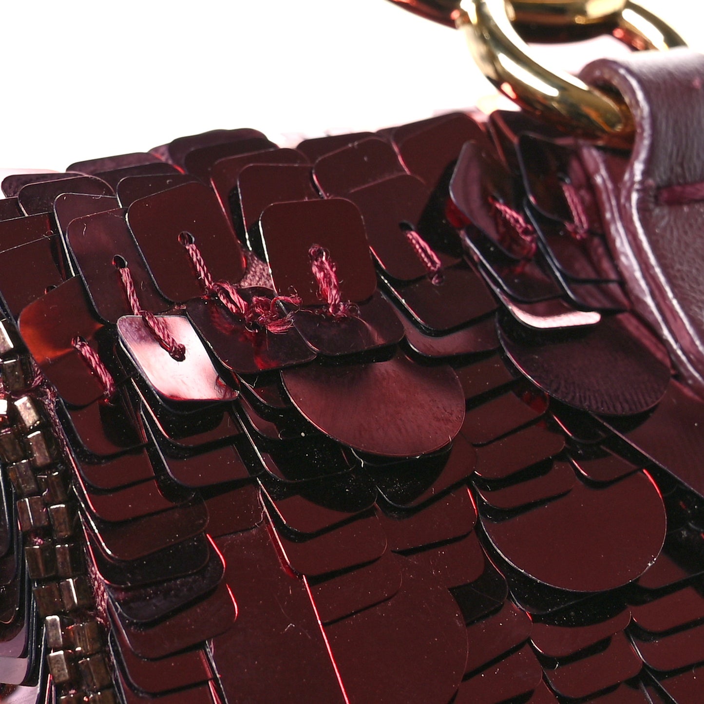 This is an authentic FENDI Sequin Paillettes Shiny Nappa Sex and the City Nano Maxi Buckle Baguette Charm in Granata. This chic nano baguette charm is crafted of dark red sequins and gold polished hardware. The bag features a round clasp on the rear and an adjustable gold cross-body chain shoulder strap. The flap opens to a pink satin interior with a pocket.Follow this item for alerts. Fendi is a registered trademark of Fendi. FASHIONPHILE is not affiliated with Fendi.