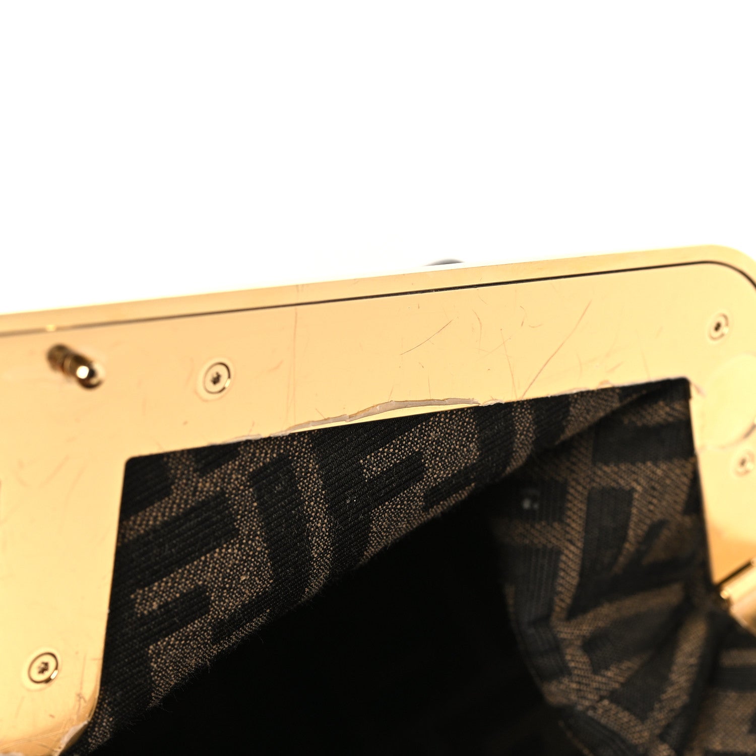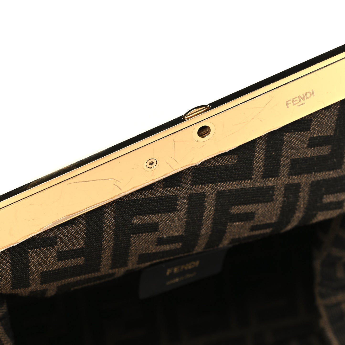This is an authentic FENDI Shiny Nappa Medium Fendi First in Black. This chic bag is crafted of lambskin leather in black. The bag features a matching optional shoulder strap with polished gold-tone hardware. The top opens with a prominent hinged, gold-tone Fendi logo detail to a spacious interior. The bag is lined with the signature Fendi FF fabric jacquard motif.Follow this item for alerts. Fendi is a registered trademark of Fendi. FASHIONPHILE is not affiliated with Fendi.
