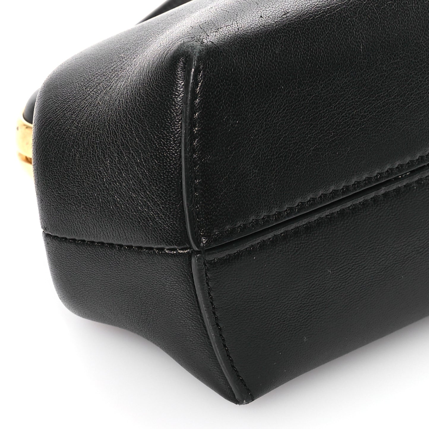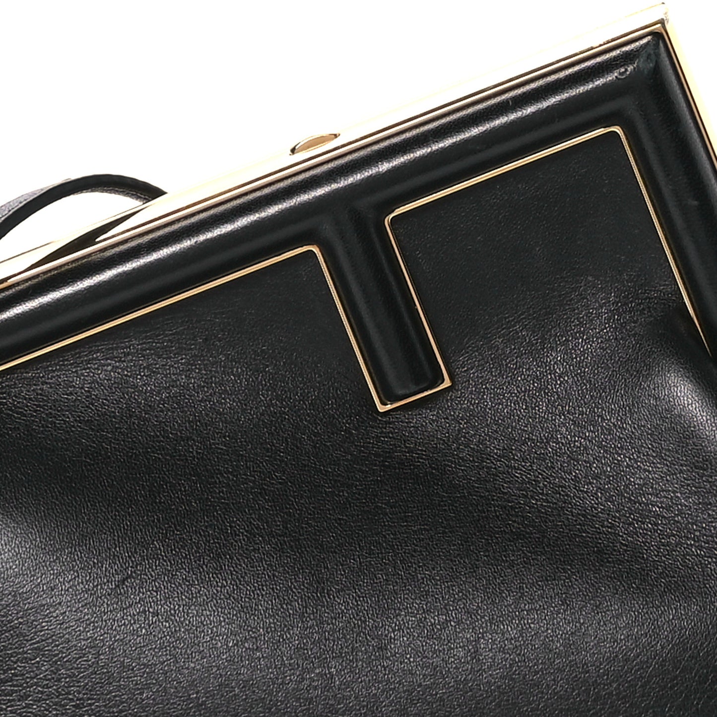 This is an authentic FENDI Shiny Nappa Small Fendi First in Black. This chic bag is crafted of nappa leather in black. The bag features a matching optional shoulder strap with polished gold-tone hardware. The top opens with a prominent hinged, gold-tone Fendi logo detail to a spacious interior. The bag is lined with the signature Fendi FF fabric jacquard motif.Follow this item for alerts. Fendi is a registered trademark of Fendi. FASHIONPHILE is not affiliated with Fendi.