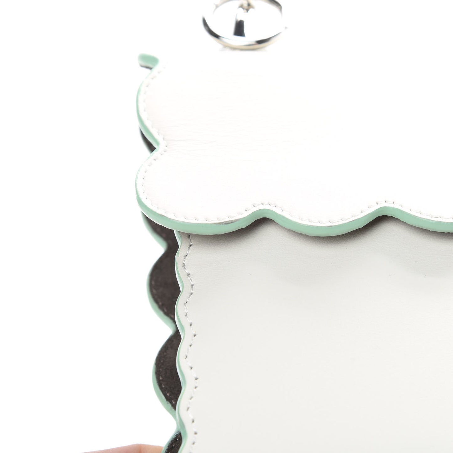 This is an authentic FENDI Vitello Baltico Scalloped Studded Kan I Shoulder Bag in Bianco. This chic top handle bag is crafted in white leather. The bag features contrasting scalloped edging in blue, a polished silver chain link shoulder strap with a leather shoulder pad, and a front flap with double plexiglass stud closure. This opens to a partitioned grey suede interior with a patch pocket.Follow this item for alerts. Fendi is a registered trademark of Fendi. FASHIONPHILE is not affiliated with Fendi.
