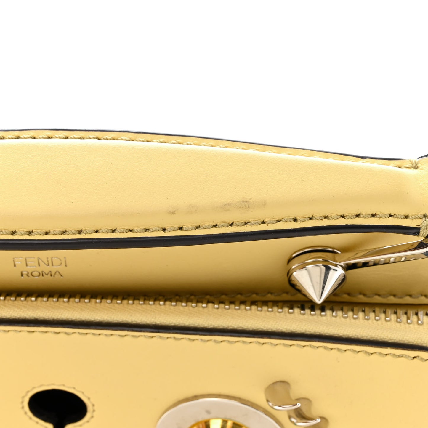 This is an authentic FENDI Vitello Dolce Hypnoteyes Small DotCom Click Chain Satchel in Grano and Multicolor. This chic and stylish satchel is crafted of fine smooth calfskin leather in yellow and decorated with multicolored resin and polished silver adornments. The shoulder bag features a thick leather strap top handle and a crossbody chain shoulder strap with a leather shoulder pad. There are two over-extending silver top zippers that open to partitioned grey suede interiors with a patch pocket.Follow this item for alerts. Fendi is a registered trademark of Fendi. FASHIONPHILE is not affiliated with Fendi.