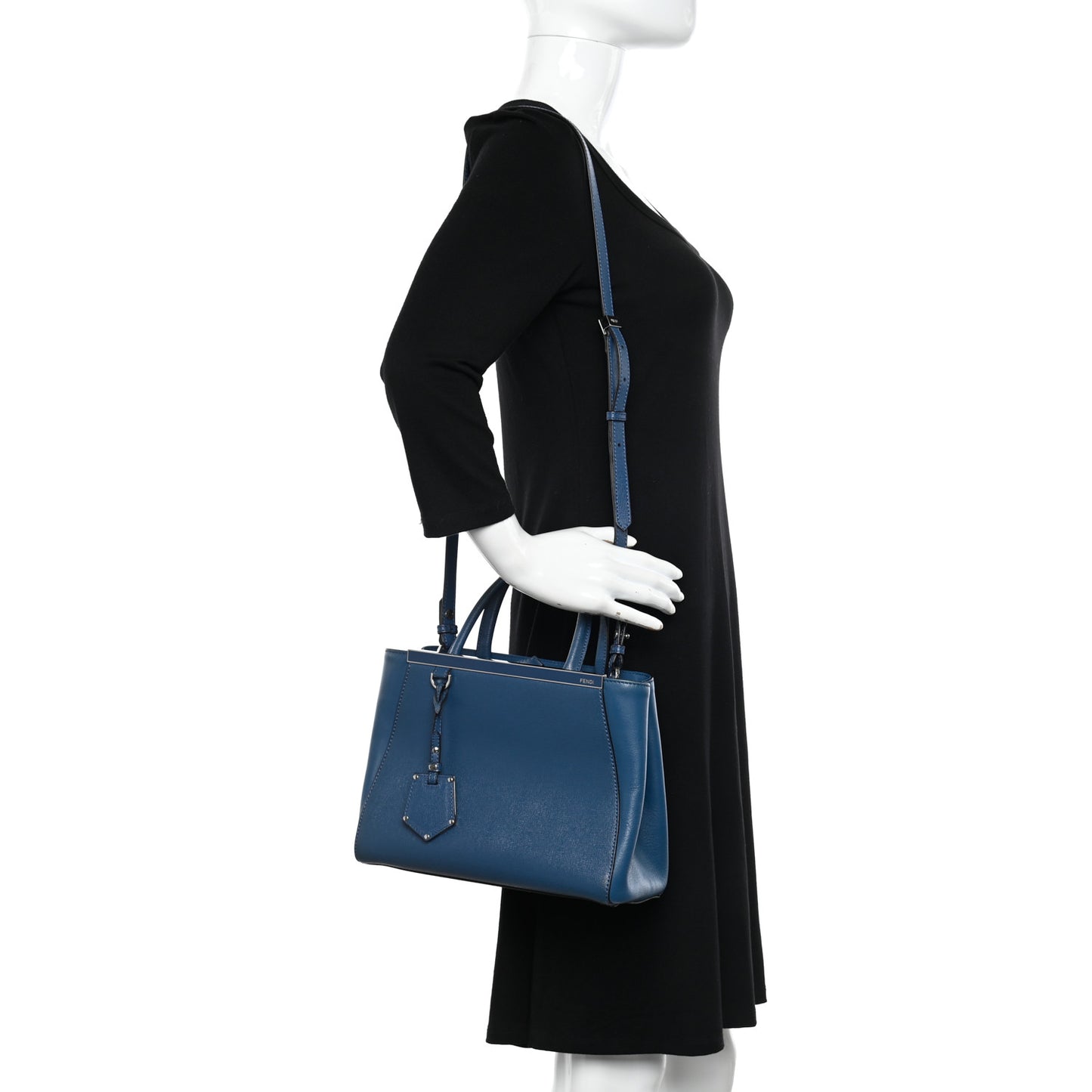 This is an authentic FENDI Vitello Elite Petite 2Jours Tote in Blue Cobalto. This stylish handbag is crafted of multi-textured calfskin leather in blue. It features rolled leather top handles, an optional shoulder strap, and a wide open top. The top unsnaps to a partitioned fabric interior with a central zippered pocket.Follow this item for alerts. Fendi is a registered trademark of Fendi. FASHIONPHILE is not affiliated with Fendi.
