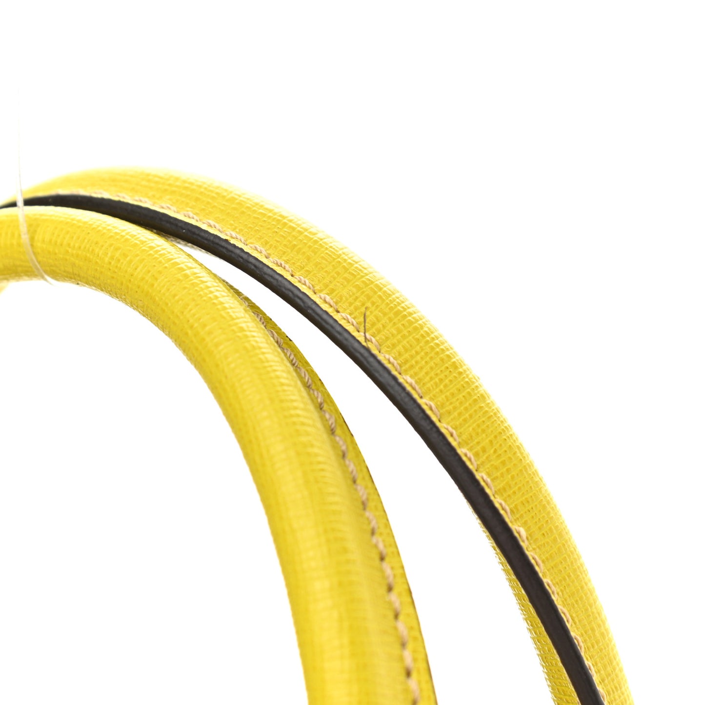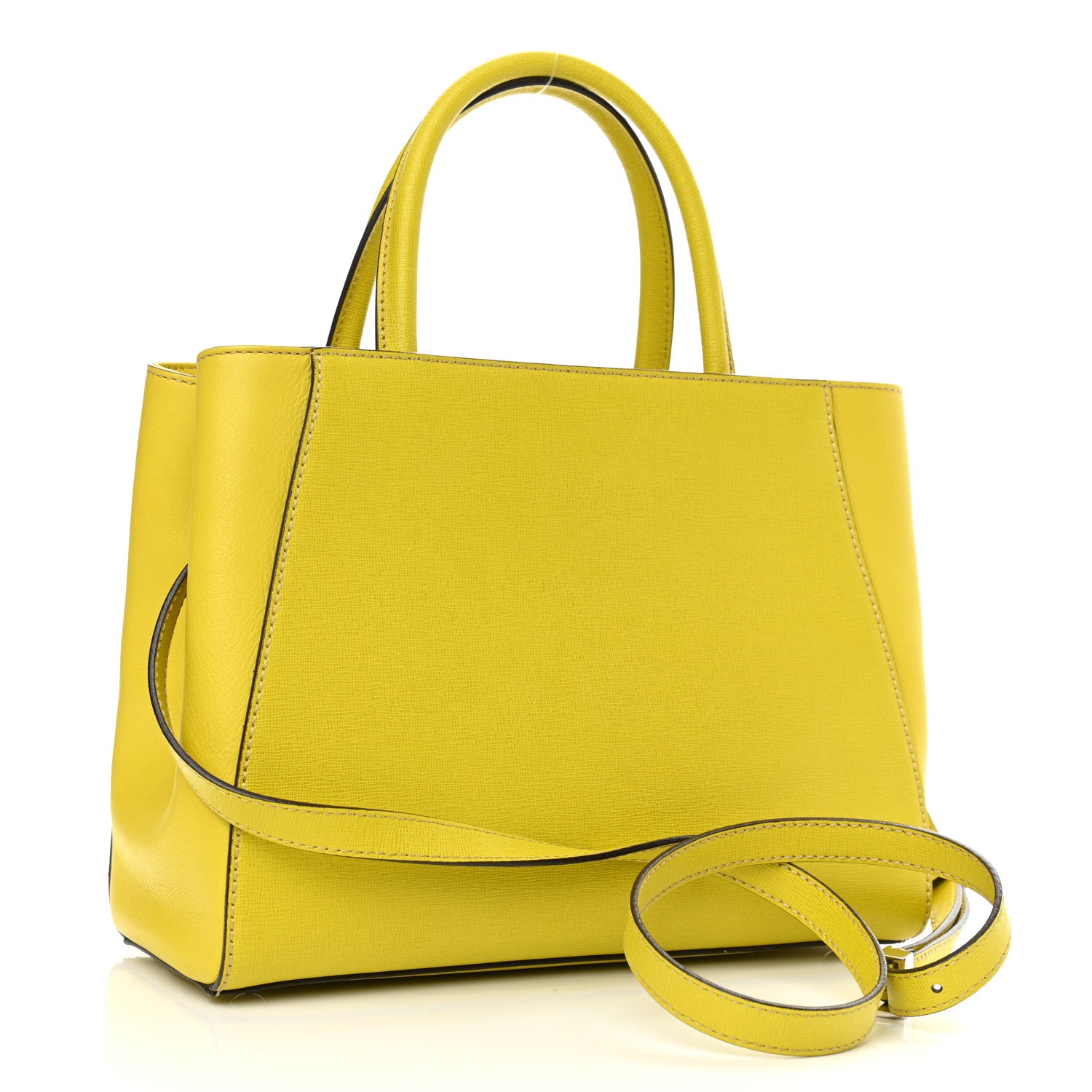 This is an authentic FENDI Vitello Elite Petite 2Jours Tote in Cedar Yellow. This stylish tote is crafted of calfskin leather in bright yellow. The bag features sturdy rolled leather top handles, an optional shoulder strap and expansive sides with a frame top. This opens to a partitioned fabric interior with zippered and patch pockets.Follow this item for alerts. Fendi is a registered trademark of Fendi. FASHIONPHILE is not affiliated with Fendi.