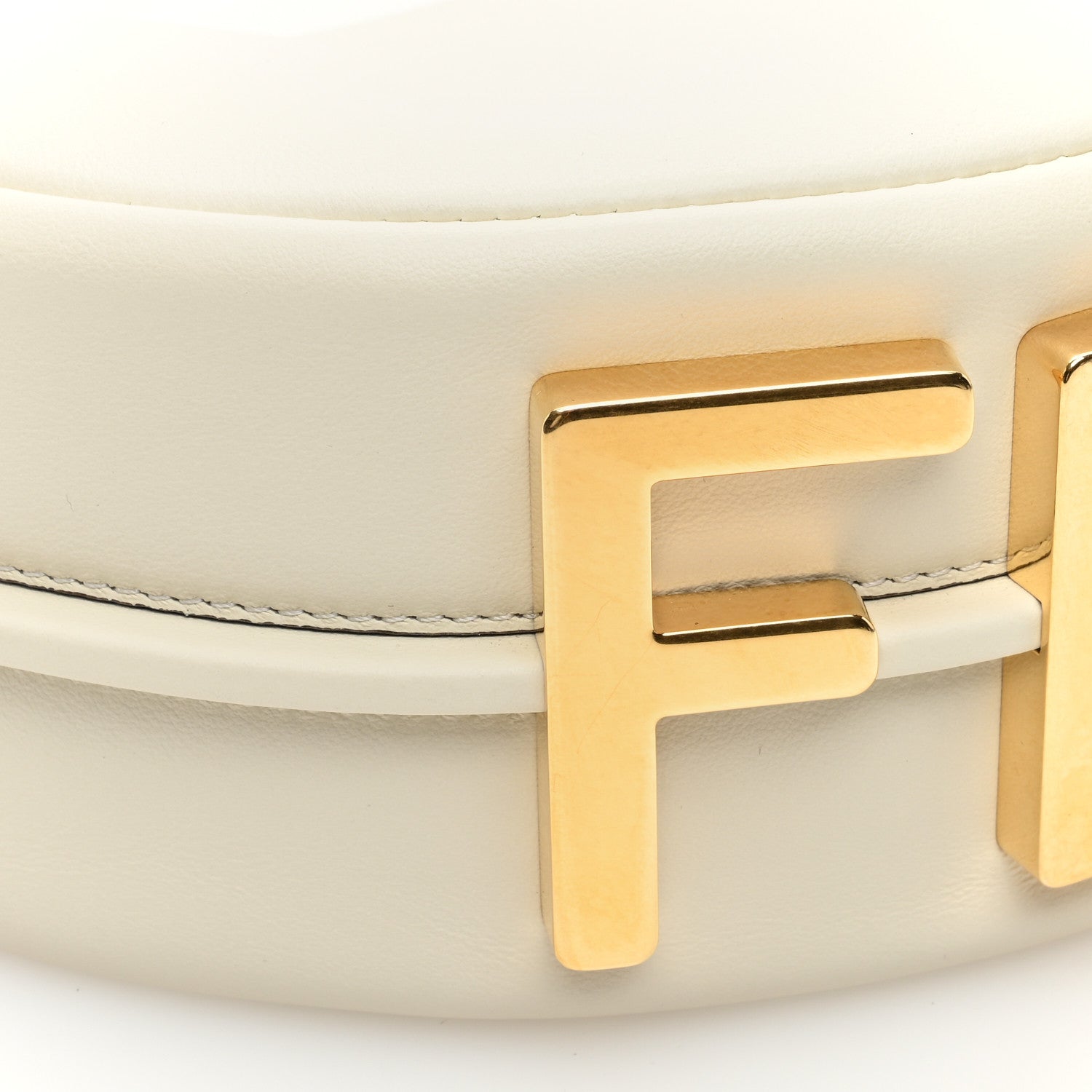 This is an authentic FENDI Vitello Grace Matte Small Fendigraphy Hobo Bag in White Ice. This stylish shoulder bag is crafted in smooth white leather. The bag features five gold-tone feet at the base spelling out FENDI, an optional leather shoulder strap, and gold-tone hardware. The top zipper opens to a spacious dark brown fabric interior.Follow this item for alerts. Fendi is a registered trademark of Fendi. FASHIONPHILE is not affiliated with Fendi.
