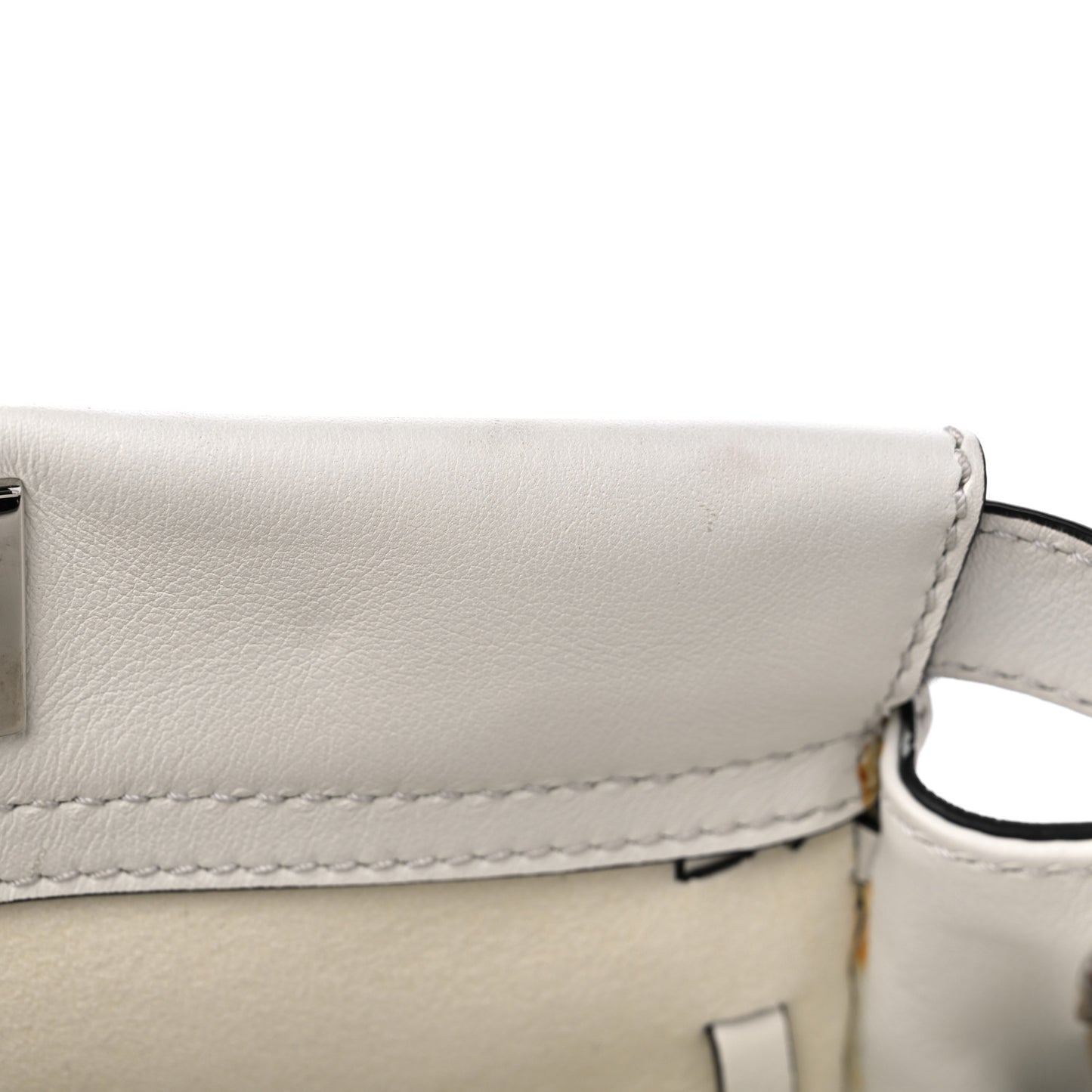 This is an authentic FENDI Vitello Seta Century Nappa Whipstitch Medium Peekaboo Iconic Satchel in White. This chic tote is finely crafted of white calfskin leather. This bag features a whipstitch trim, leather top handle, an optional shoulder strap, and silver hardware. The turn-lock opens to a leather and suede interior with a zipper pocket.Follow this item for alerts. Fendi is a registered trademark of Fendi. FASHIONPHILE is not affiliated with Fendi.