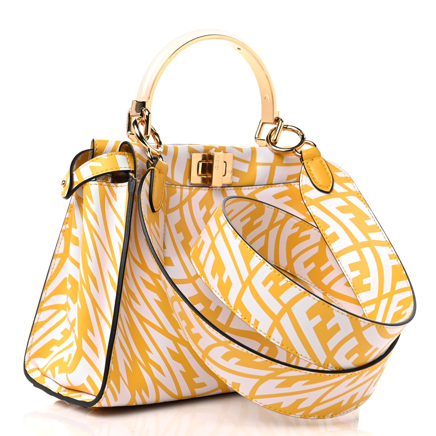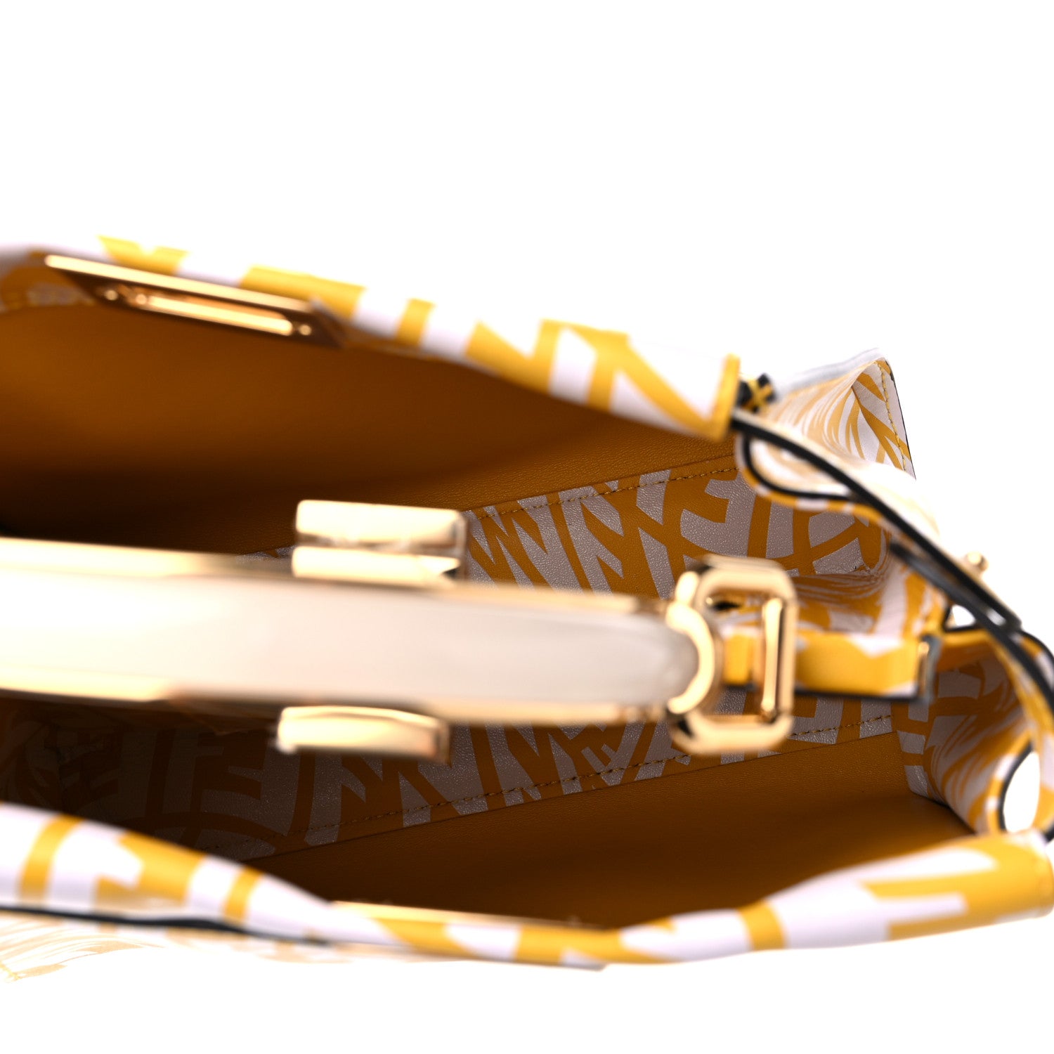 This is an authentic FENDI X SARAH COLEMAN Vitello Liberty Shiny Nappa Plexiglass FF Vertigo Mini Peekaboo Iconic Satchel in Mimosa and White. This top handle bag is crafted of calfskin leather with the FF Vertigo motif in yellow and white. The shoulder bag features a removable shoulder strap and opens with a turn lock to a partitioned leather interior with patch pockets.Follow this item for alerts. Fendi is a registered trademark of Fendi. FASHIONPHILE is not affiliated with Fendi.