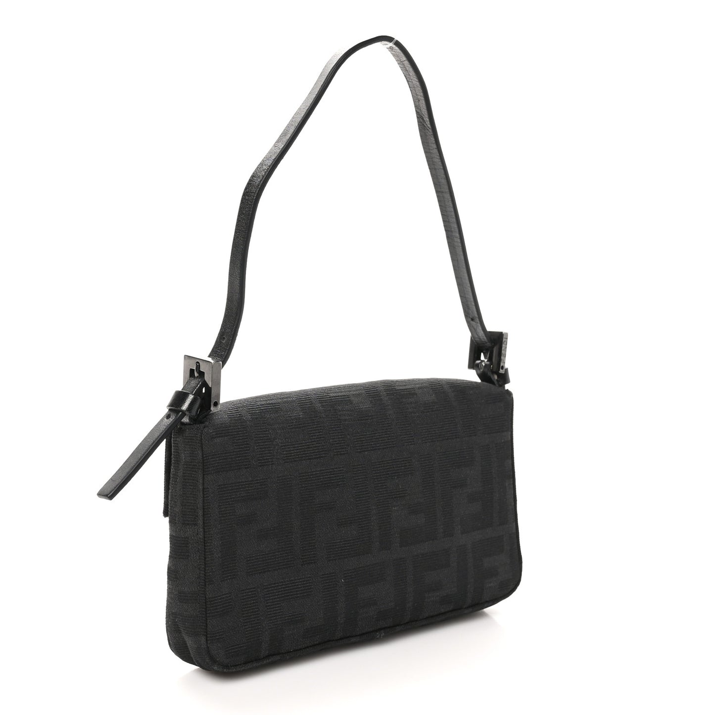 This is an authentic FENDI Zucca Mini Baguette in Black. This mini baguette is crafted of black Fendi Zucca logo canvas in black. The bag features an adjustable black leather shoulder strap and a crossover flap with prominent gunmetal grey FF hardware emblem. The flap opens with a magnetic snap to a black fabric interior with a patch pocket.Follow this item for alerts. Fendi is a registered trademark of Fendi. FASHIONPHILE is not affiliated with Fendi.