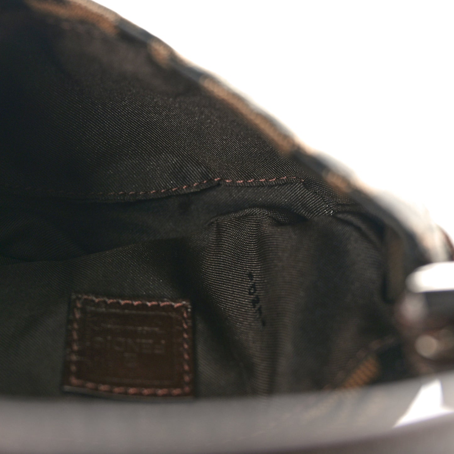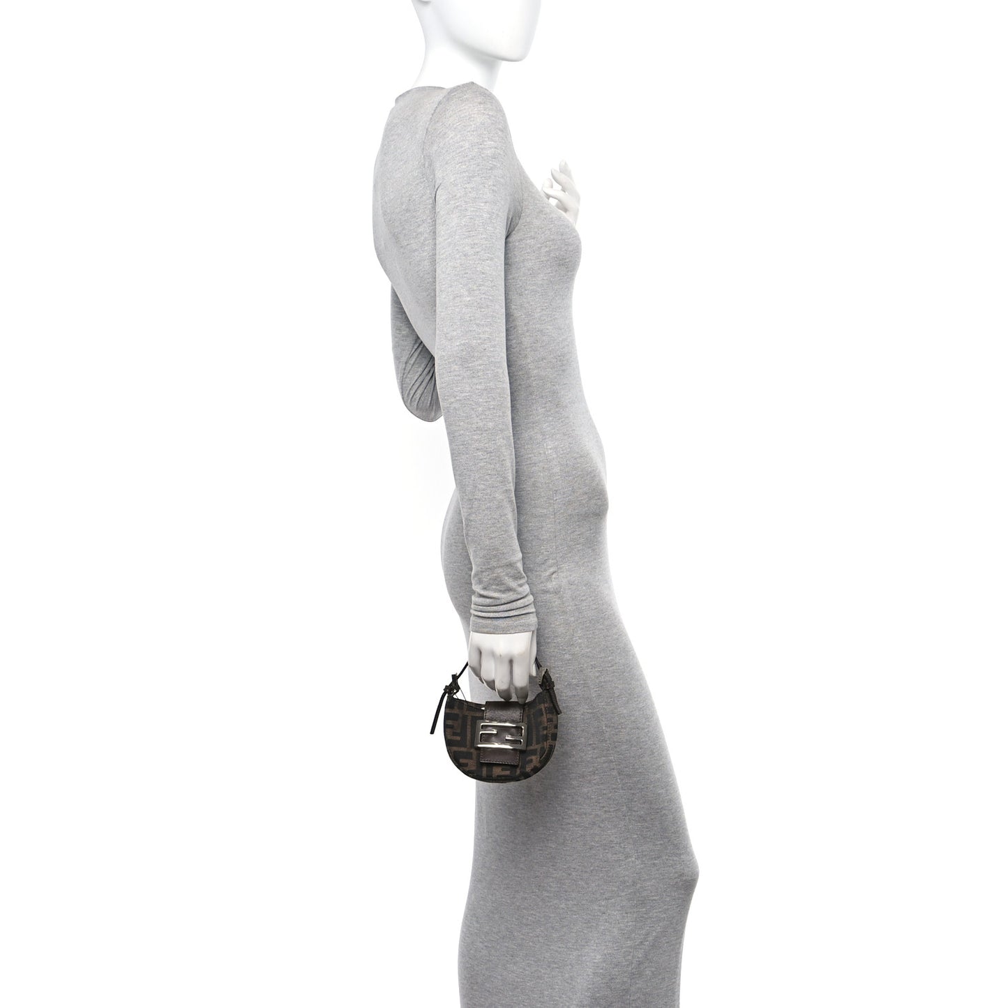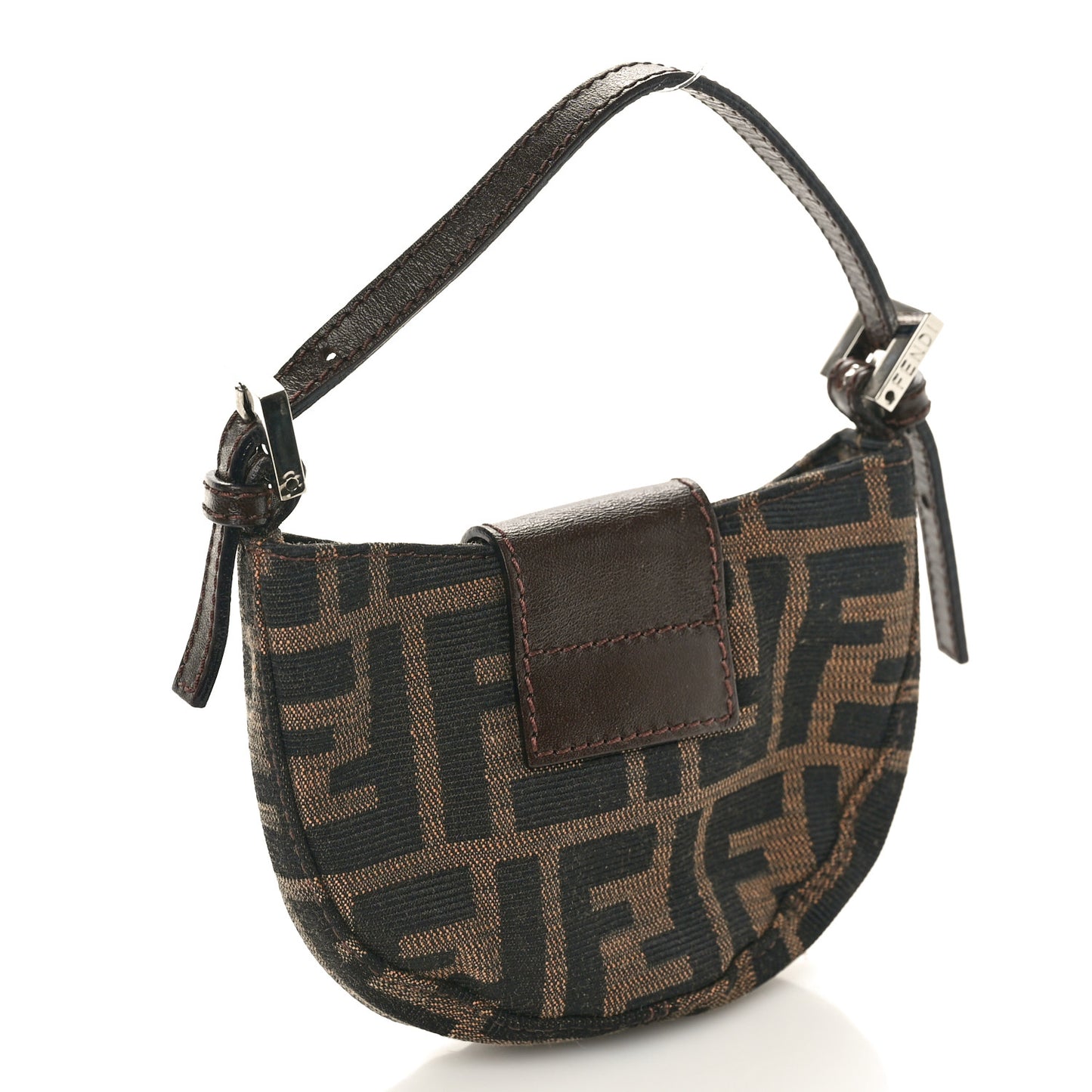 This is the gorgeous and authentic FENDI Zucca Mini Half Moon Baguette in Tobacco. The bag is a simple pocket with a wide strap closure to keep it secure. The minimal crescent shape is made of Fendi zucca monogram, and features a leather strap handle with silver hardware. This is complemented by silver hardware accents featuring a bold Fendi double F seal closure on the front of the bag. The interior of the bag is a brown fabric.Follow this item for alerts. Fendi is a registered trademark of Fendi. FASHIONPHILE is not affiliated with Fendi.