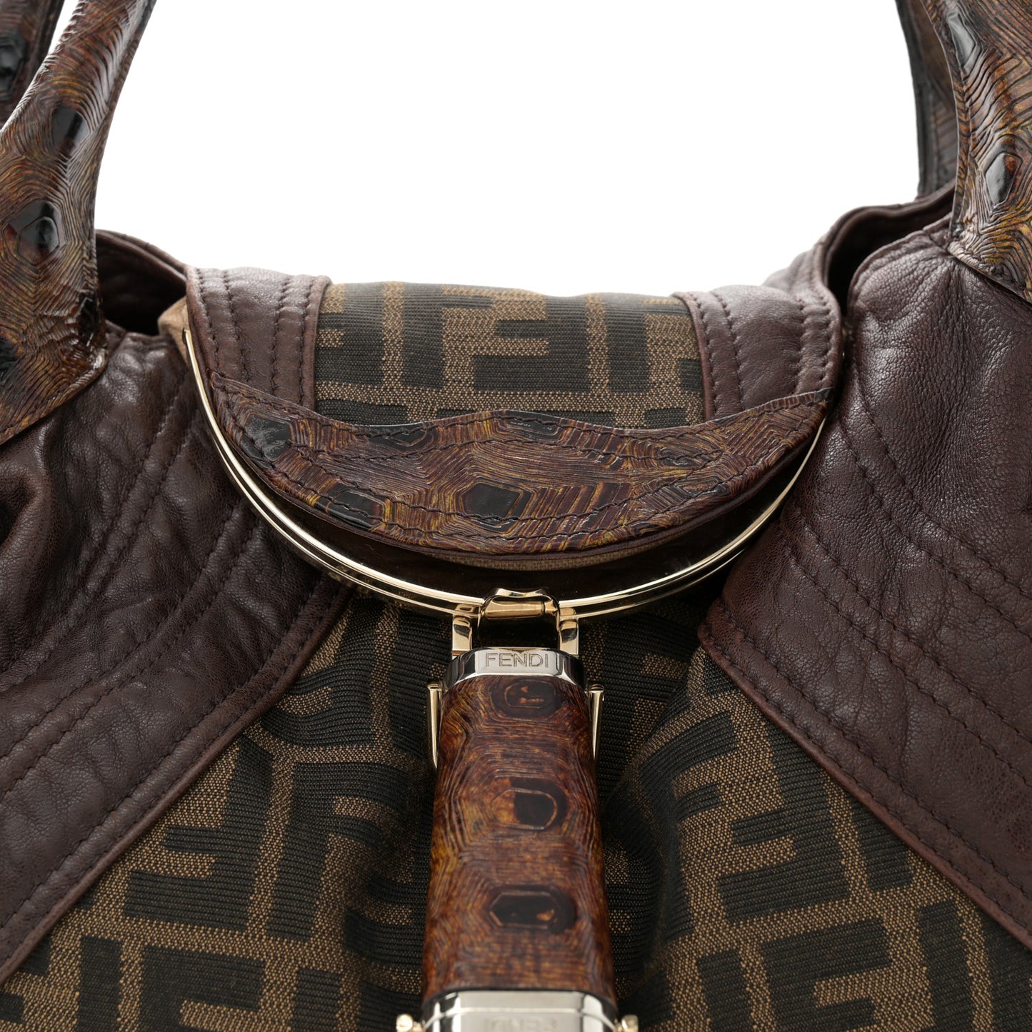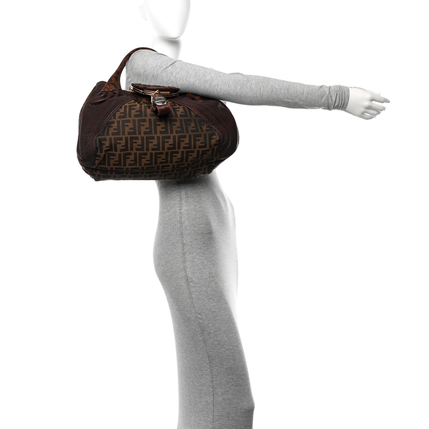 This is an authentic FENDI Zucca Nappa Nuvolata Vitello Tortuga Spy in Tobacco and Moro. This chic bag is crafted of soft nappa dark brown calfskin leather that has been pleated and tailored with Fendi FF Zucca canvas in the center. The bag features a tortoise-colored leather handles that are wider at their base. The bag opens to a beige fabric interior.Follow this item for alerts. Fendi is a registered trademark of Fendi. FASHIONPHILE is not affiliated with Fendi.