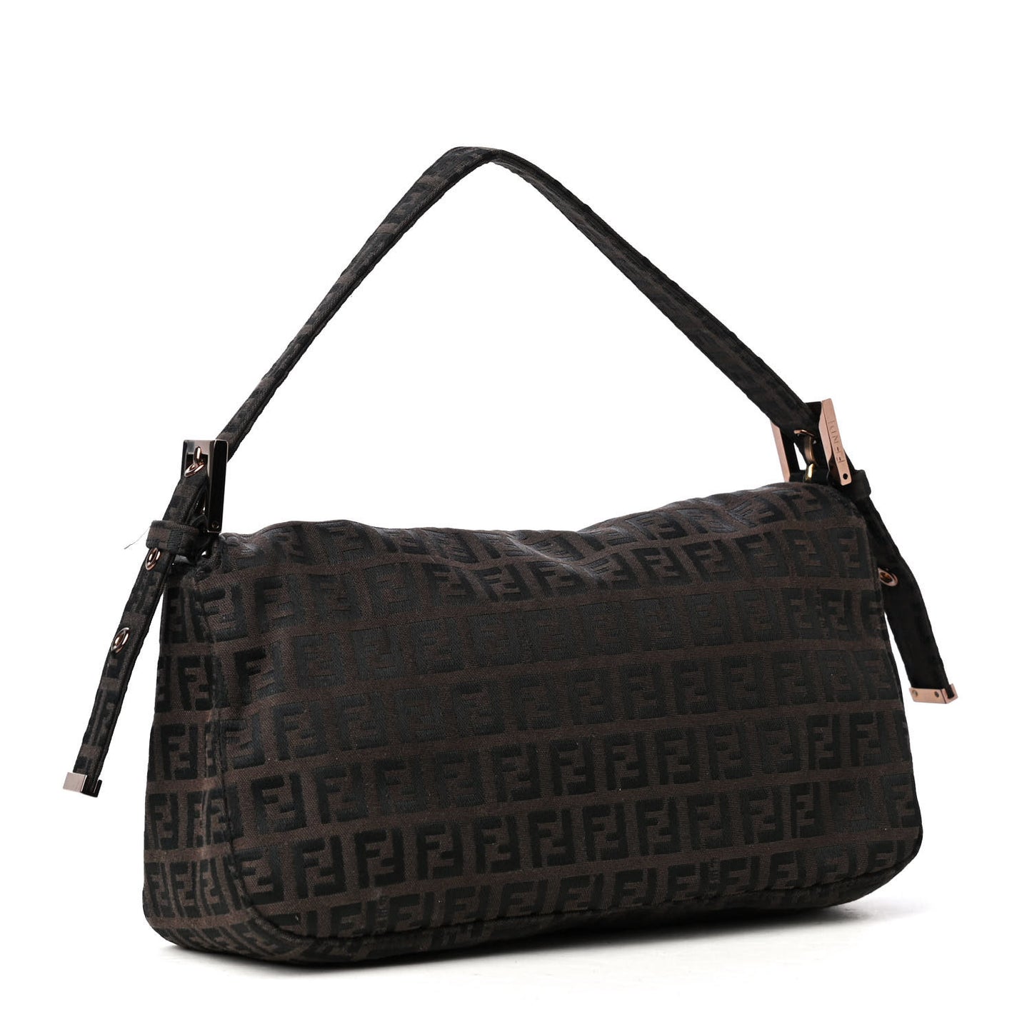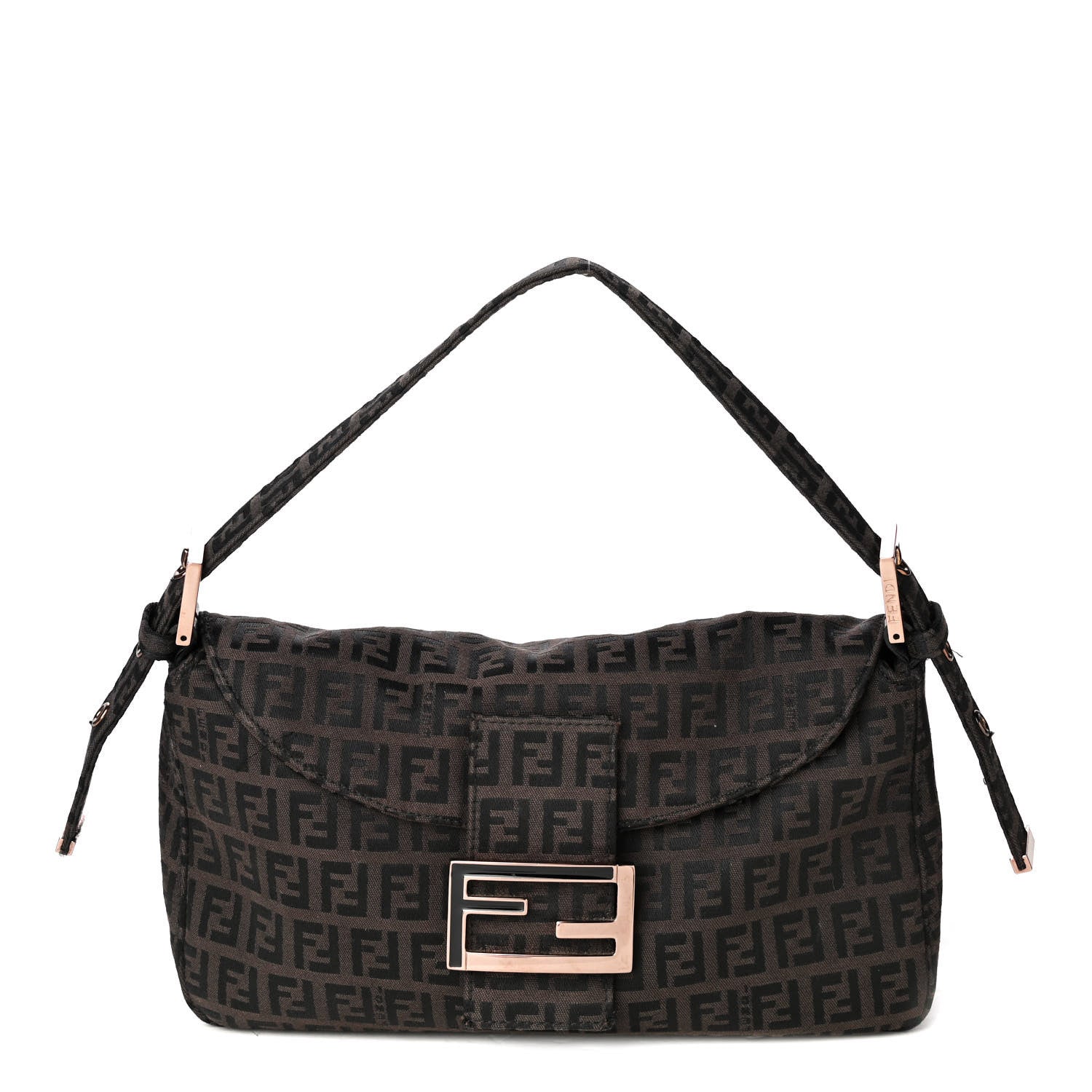 This is an authentic FENDI Zucchino Baguette in Brown. This stylish baguette is crafted of Fendi FF Zucchino canvas in black with dark silver hardware. It features an FF logo flap and an adjustable looping shoulder strap. The hidden snap closure opens to a black fabric logo interior with a zipper pocket.Follow this item for alerts. Fendi is a registered trademark of Fendi. FASHIONPHILE is not affiliated with Fendi.