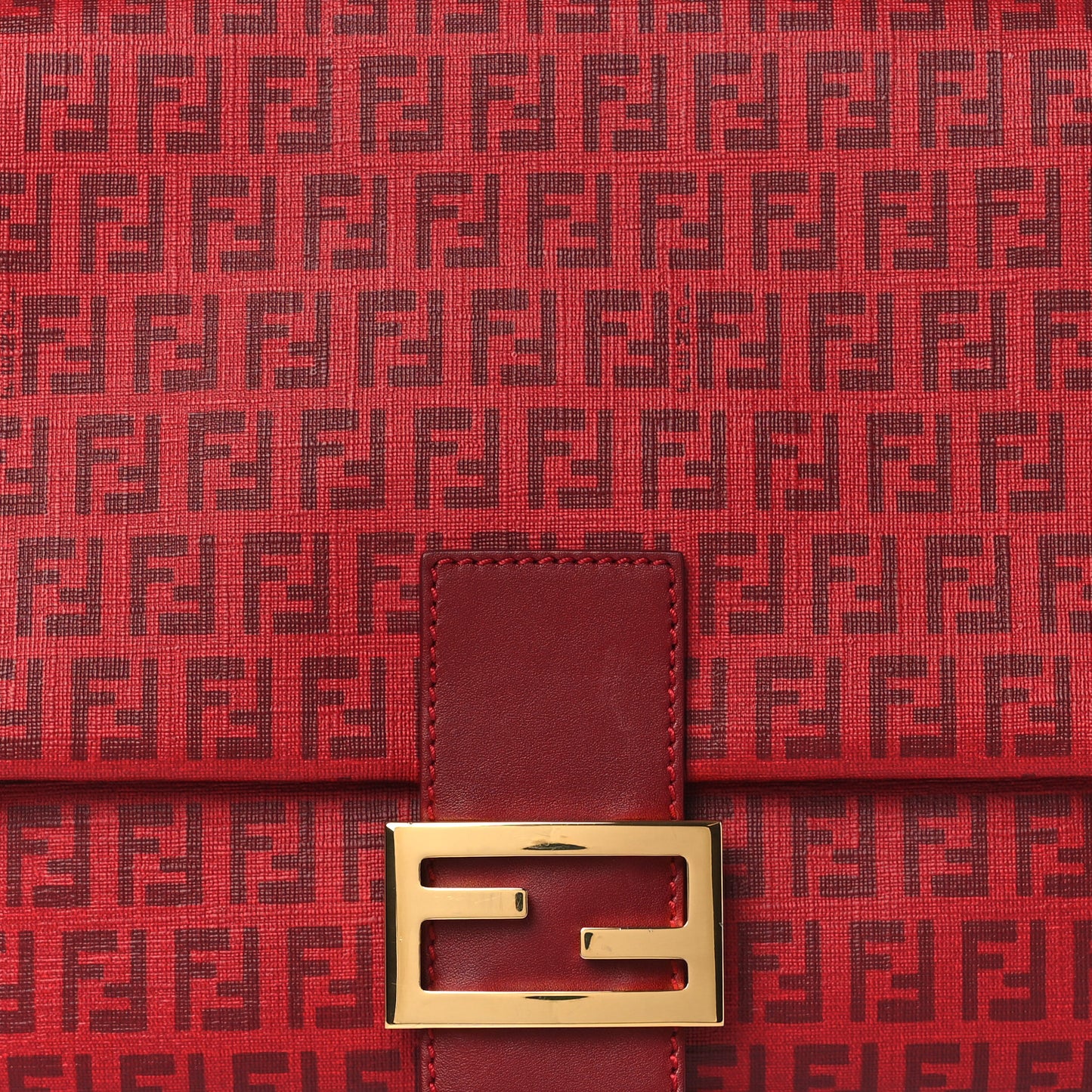This is an authentic FENDI Zucchino Spalmati Vitello Mama Baguette in Bordeaux Rubino. This stylish shoulder bag is finely crafted of Fendi Zucchino coated canvas in red. The bag features a red leather shoulder strap, trim, and a facing flap with a polished gold Fendi FF logo. The flap opens to a grey fabric interior with a zipper pocket.Follow this item for alerts. Fendi is a registered trademark of Fendi. FASHIONPHILE is not affiliated with Fendi.