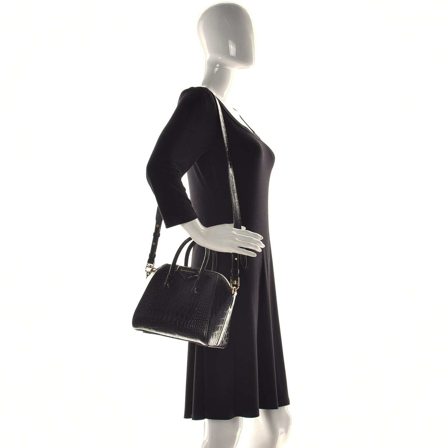 This is an authentic GIVENCHY Crocodile Embossed Calfskin Mini Antigona in Black. This elegant tote is crafted of luxurious crocodile embossed calfskin leather in black. The bag features thin but sturdy rolled leather top handles, an optional, adjustable leather shoulder strap, gold hardware, and expansive sides. The top zipper opens to a black fabric interior with zipper and patch pockets.Follow this item for alerts. Givenchy is a registered trademark of Givenchy. FASHIONPHILE is not affiliated with Givenchy.