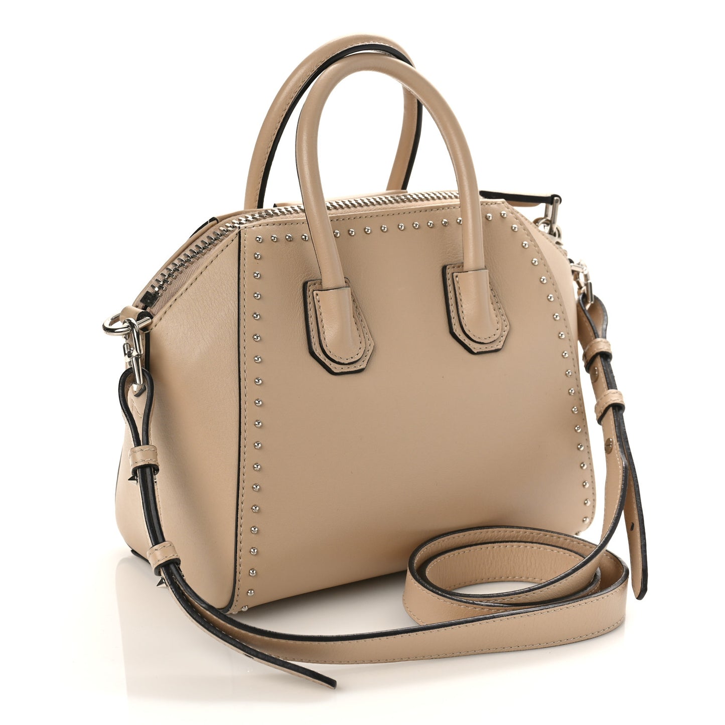This is an authentic GIVENCHY Calfskin Mini Studded Antigona in Beige Buff. This stylish tote is crafted of luxuriously polished smooth leather in beige with silver studding lining the bag. The bag features sturdy rolled leather top handles, an optional leather shoulder strap with silver hardware, and extended sides. The top zipper opens to a light beige fabric interior with zipper and patch pockets. This is a lovely tote, ideal for day and evening use, from Givenchy!Follow this item for alerts. Givenchy is a registered trademark of Givenchy. FASHIONPHILE is not affiliated with Givenchy.