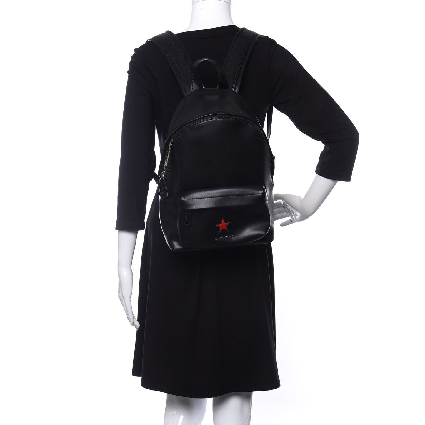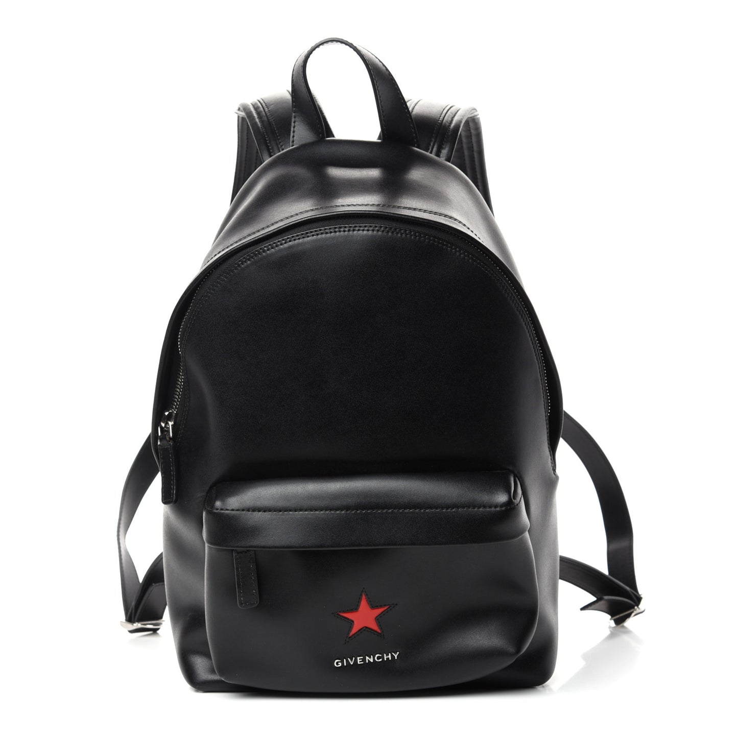 This is an authentic GIVENCHY Calfskin Star Mini Backpack in Black. This cutting-edge backpack is created of smooth calfskin leather in black. The bag features adjustable leather shoulder straps, a small top handle and an external zipper pocket with a small red star and silver Givenchy logo. The wrap-around zippers open to a spacious black fabric interior with a zipper pocket. This backpack is ideal for everyday utility or travel, from Givenchy.Follow this item for alerts. Givenchy is a registered trademark of Givenchy. FASHIONPHILE is not affiliated with Givenchy.