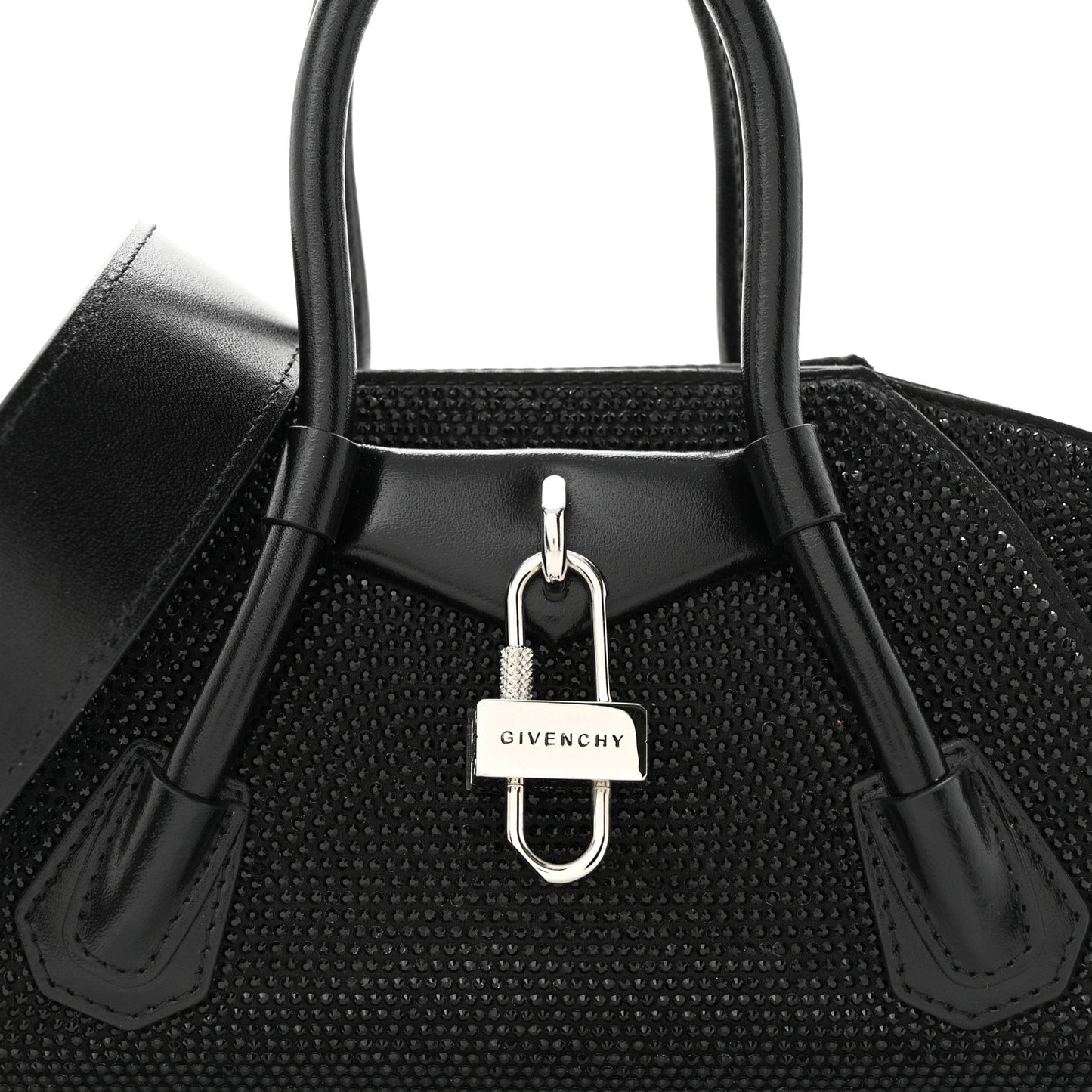 This is an authentic GIVENCHY Lambskin Satin Strass Mini Antigona Stretch in Black. This elegant handbag is crafted of satin fabric in black embellished with tiny crystals throughout. The bag features black rolled-leather top handles and trim, a removable leather shoulder strap, and polished silver hardware including a Givenchy lock charm on the front. The magnetic top opens to a black fabric interior with a patch pocket.