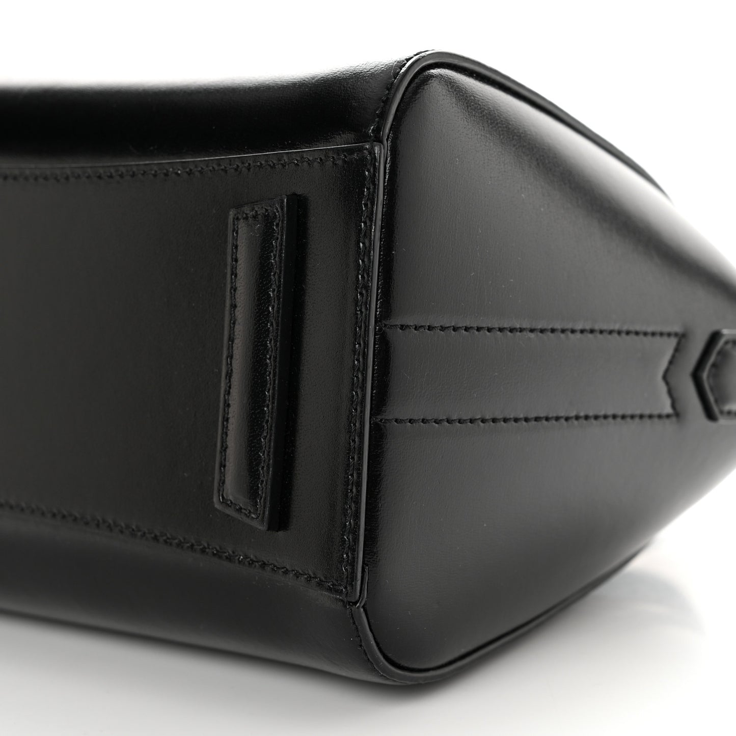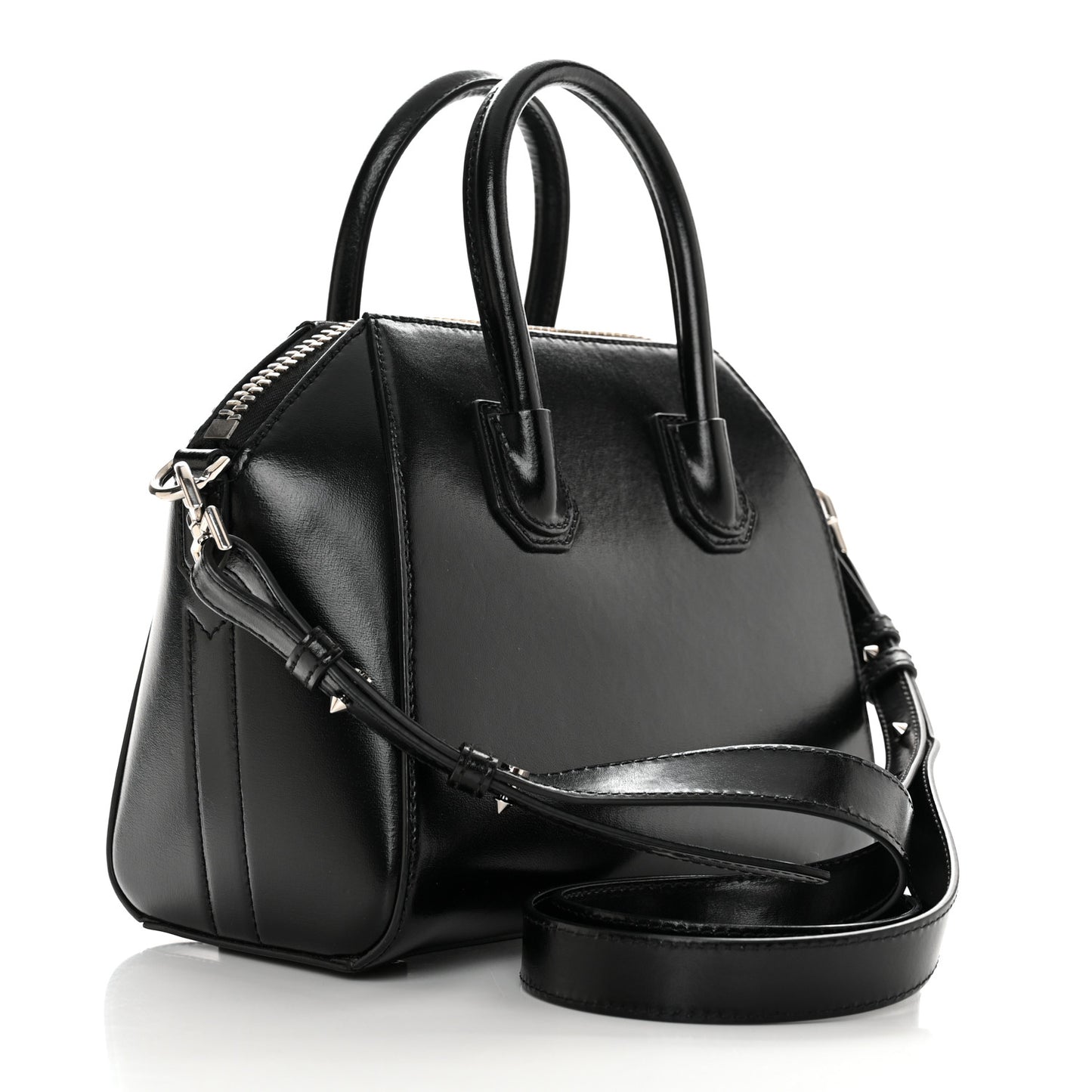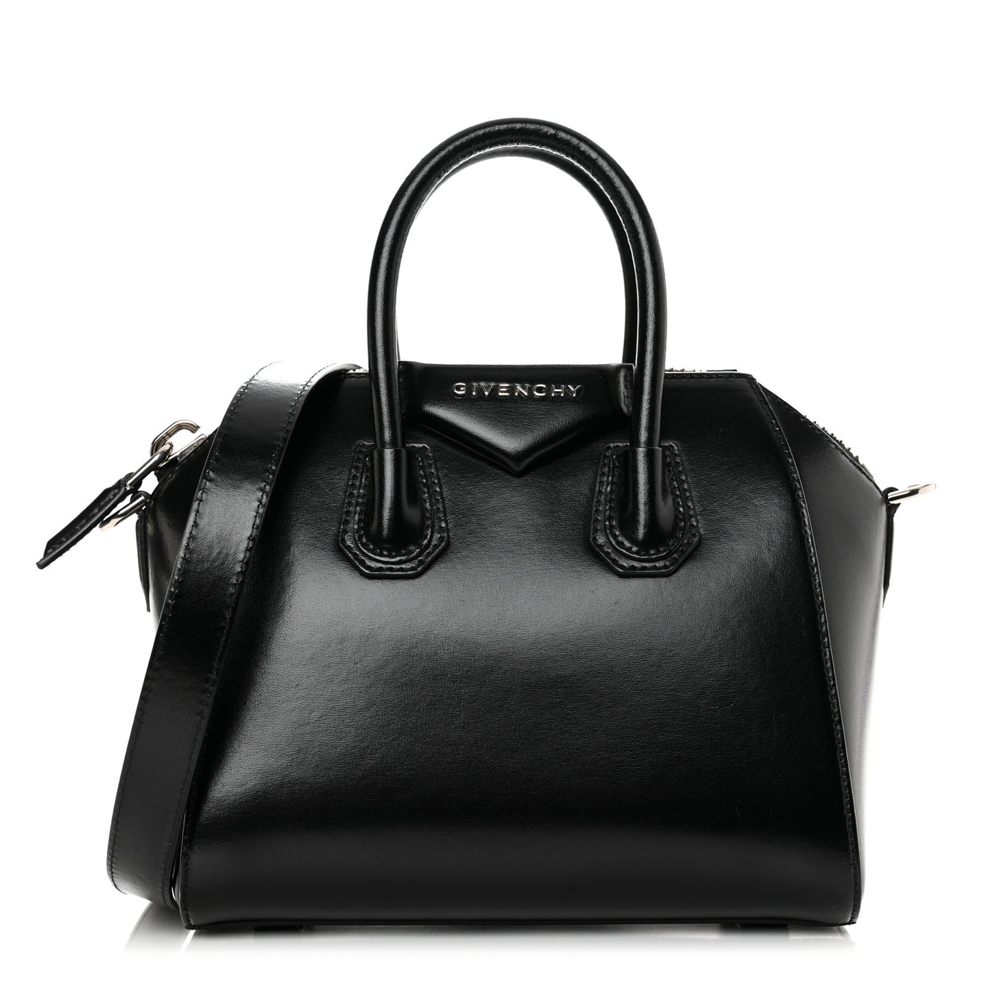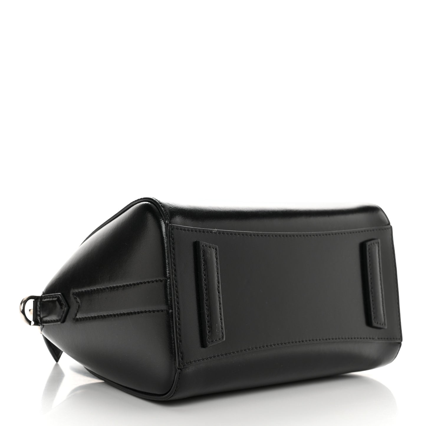 This is an authentic GIVENCHY Shiny Lord Calfskin Mini Antigona in Black. This elegant structured tote is crafted of luxuriously polished calfskin leather in black. The bag features sturdy rolled leather top handles, and an optional adjustable shoulder strap with polished silver hardware. The top zipper opens to a black fabric interior with pockets.Follow this item for alerts. Givenchy is a registered trademark of Givenchy. FASHIONPHILE is not affiliated with Givenchy.