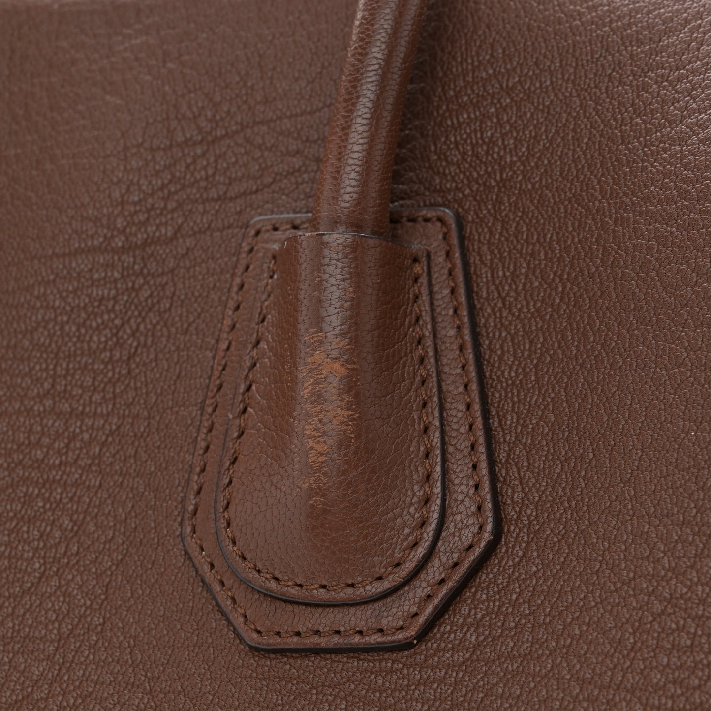 This is an authentic GIVENCHY Sugar Goatskin Medium Antigona in Cognac. This elegant tote is crafted of grained goatskin leather in caramel brown. The bag features rolled leather top handles an optional shoulder strap with silver hardware. The top zipper opens to a beige fabric interior with zipper and patch pockets.Follow this item for alerts. Givenchy is a registered trademark of Givenchy. FASHIONPHILE is not affiliated with Givenchy.