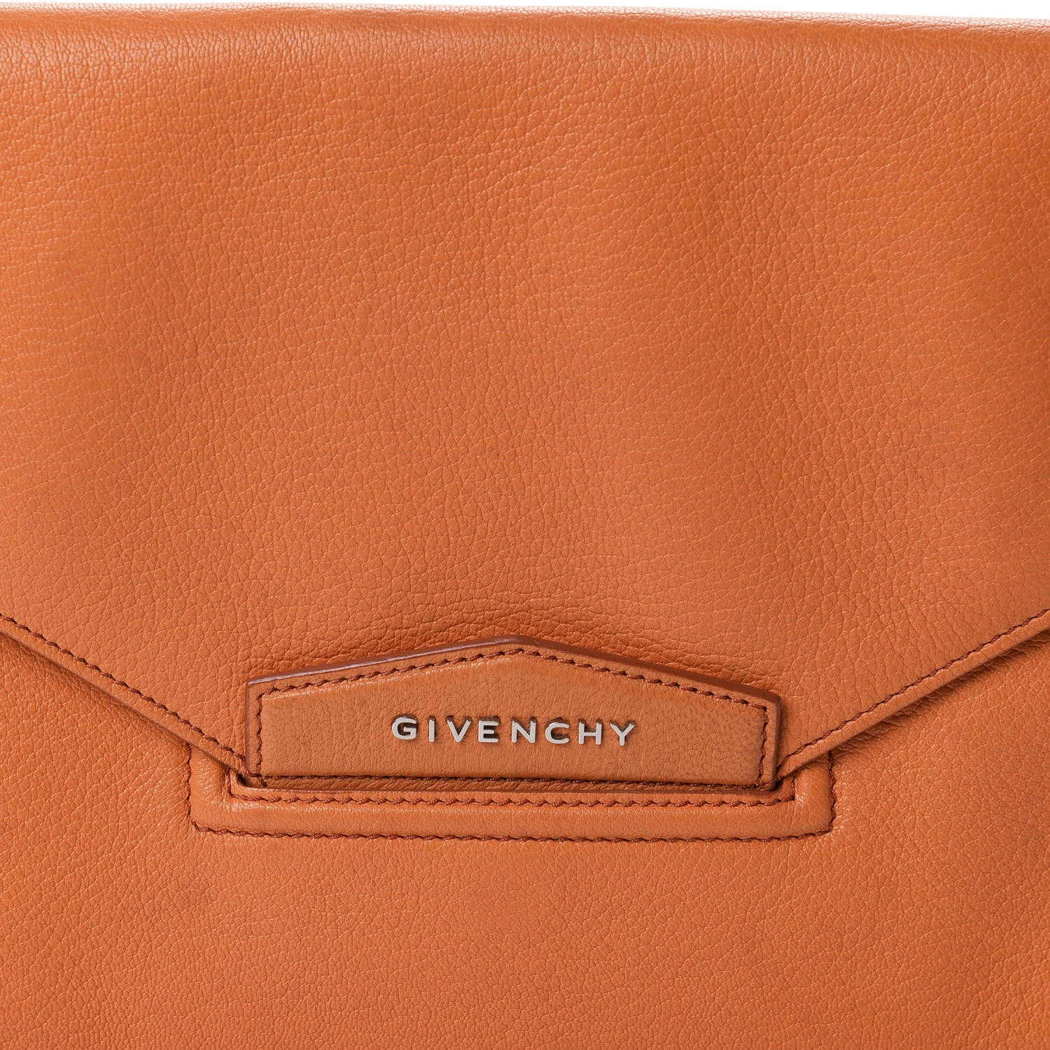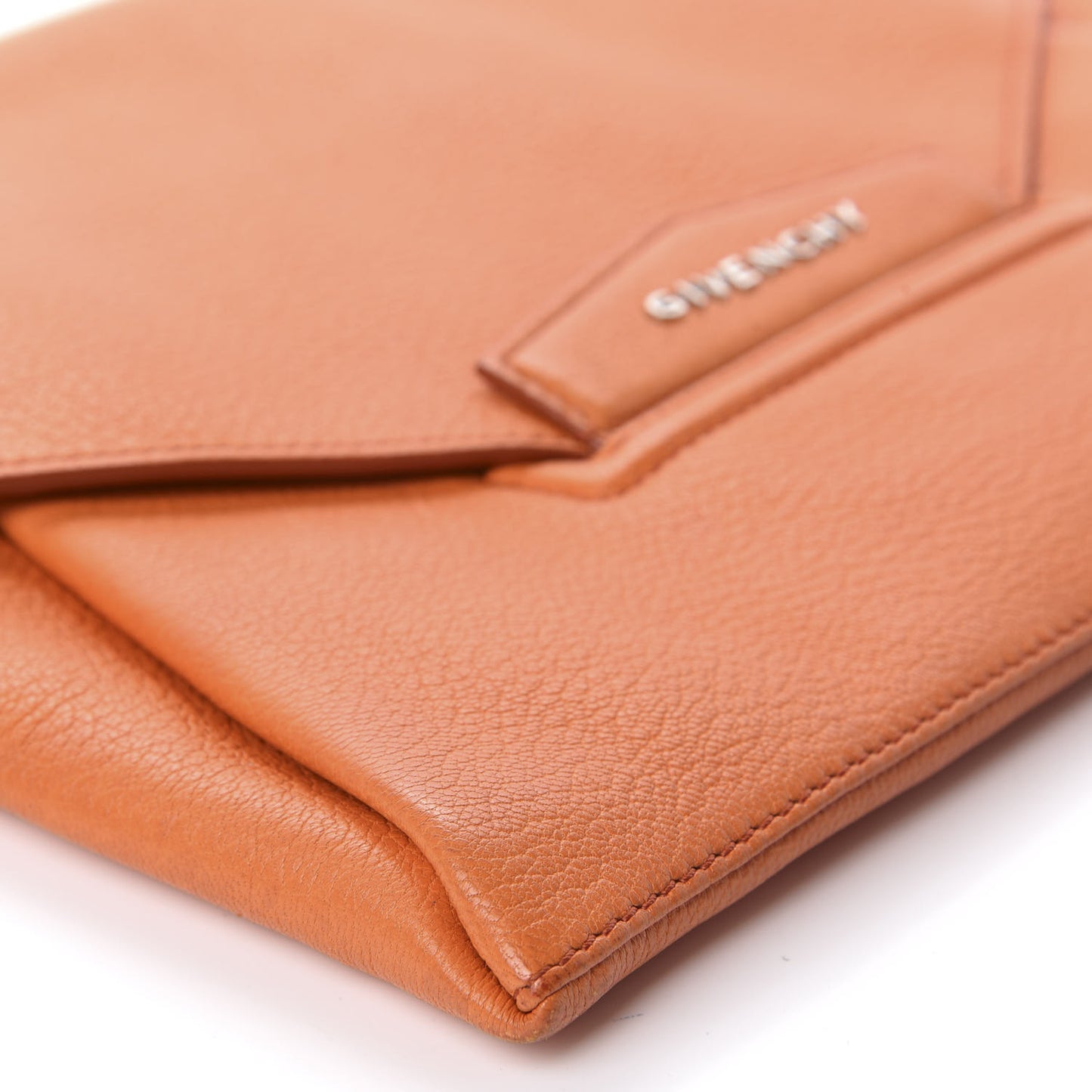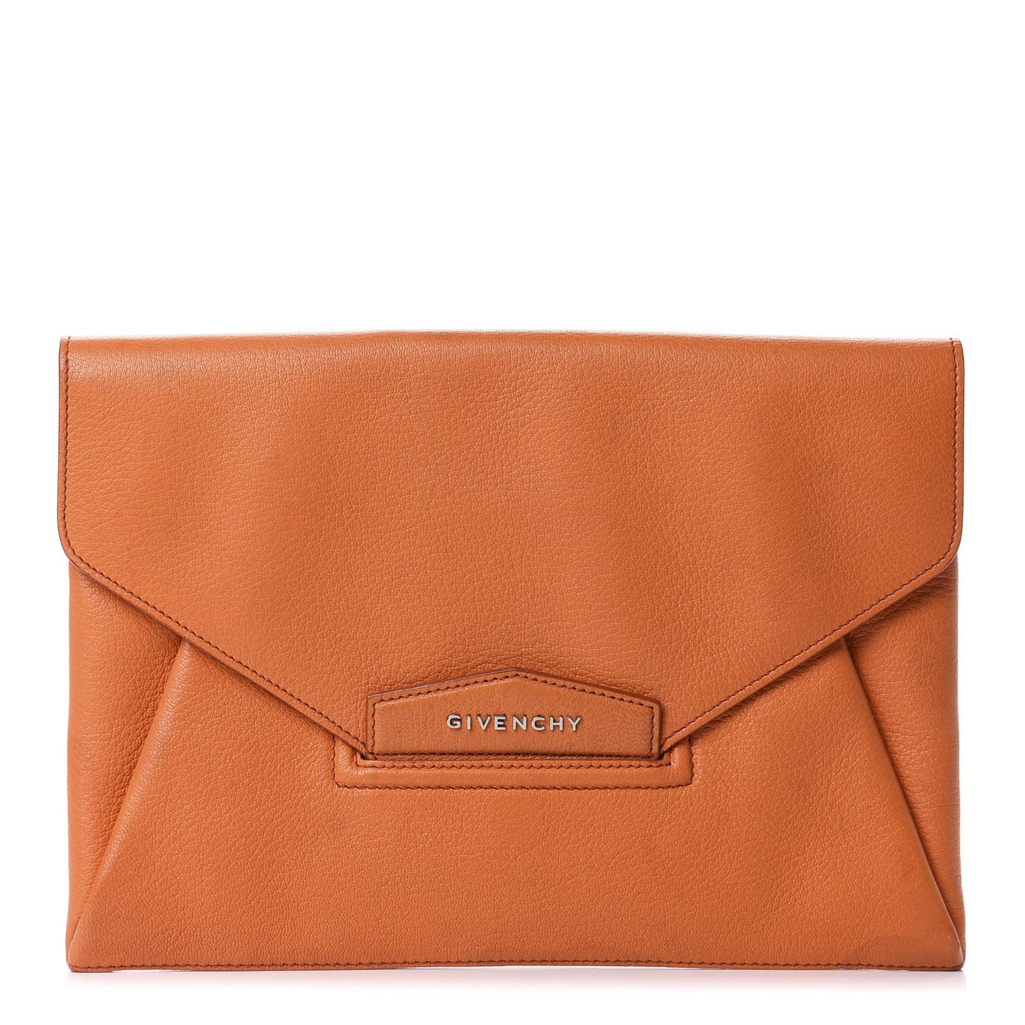 This is an authentic GIVENCHY Sugar Goatskin Medium Antigona Envelope Clutch in Orange. This luxurious clutch is a classic envelope crafted of beautifully grained goatskin leather in orange. The facing flap opens to a small patch pocket and a spacious beige interior with room for your essentials for day or evening with the classic chic from Givenchy!Follow this item for alerts. Givenchy is a registered trademark of Givenchy. FASHIONPHILE is not affiliated with Givenchy.
