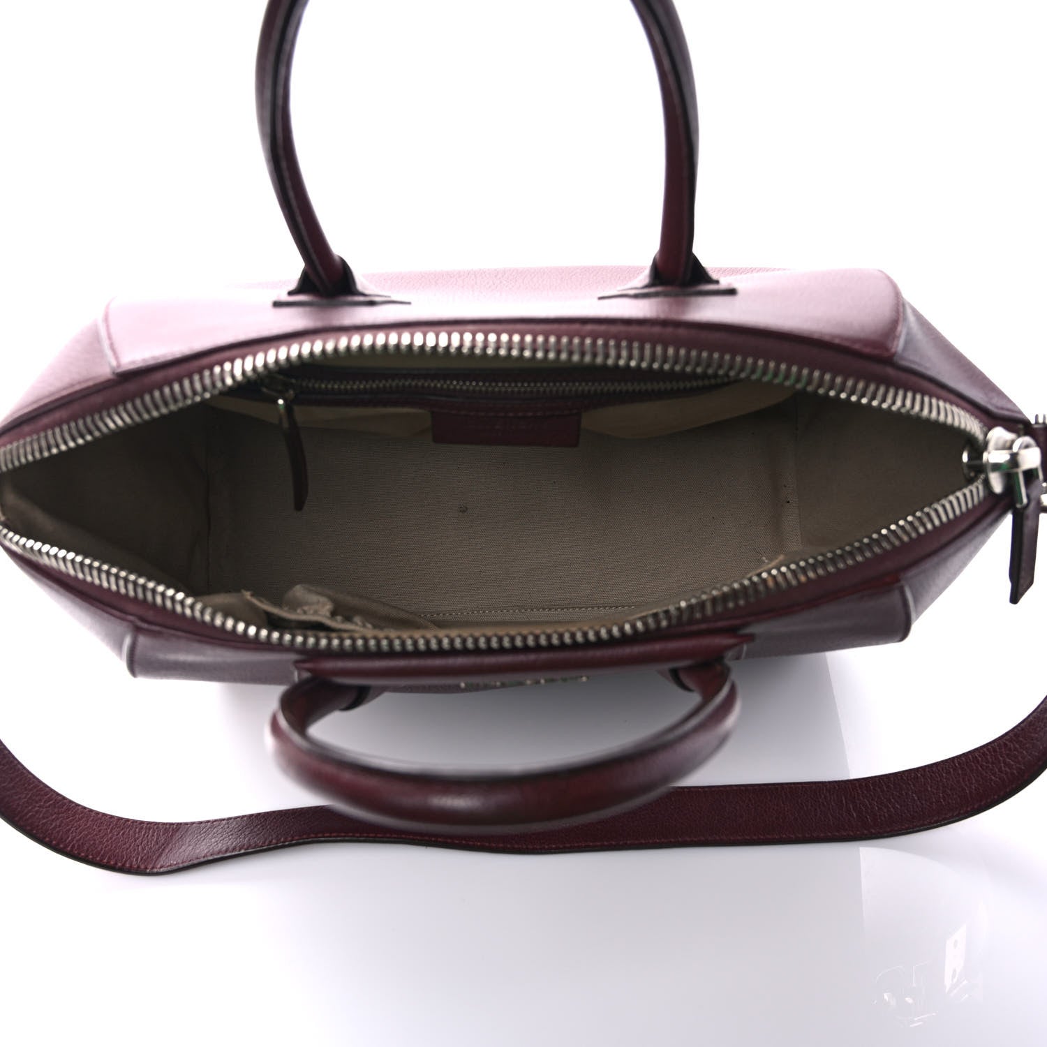 This is an authentic GIVENCHY Sugar Goatskin Medium Antigona in Oxblood. This bag is of grained goatskin leather in a rich shade of burgundy. It features rolled top handles, a leather shoulder strap, and polished silver hardware. The top zipper opens to a beige fabric interior with zipper and patch pockets.Follow this item for alerts. Givenchy is a registered trademark of Givenchy. FASHIONPHILE is not affiliated with Givenchy.