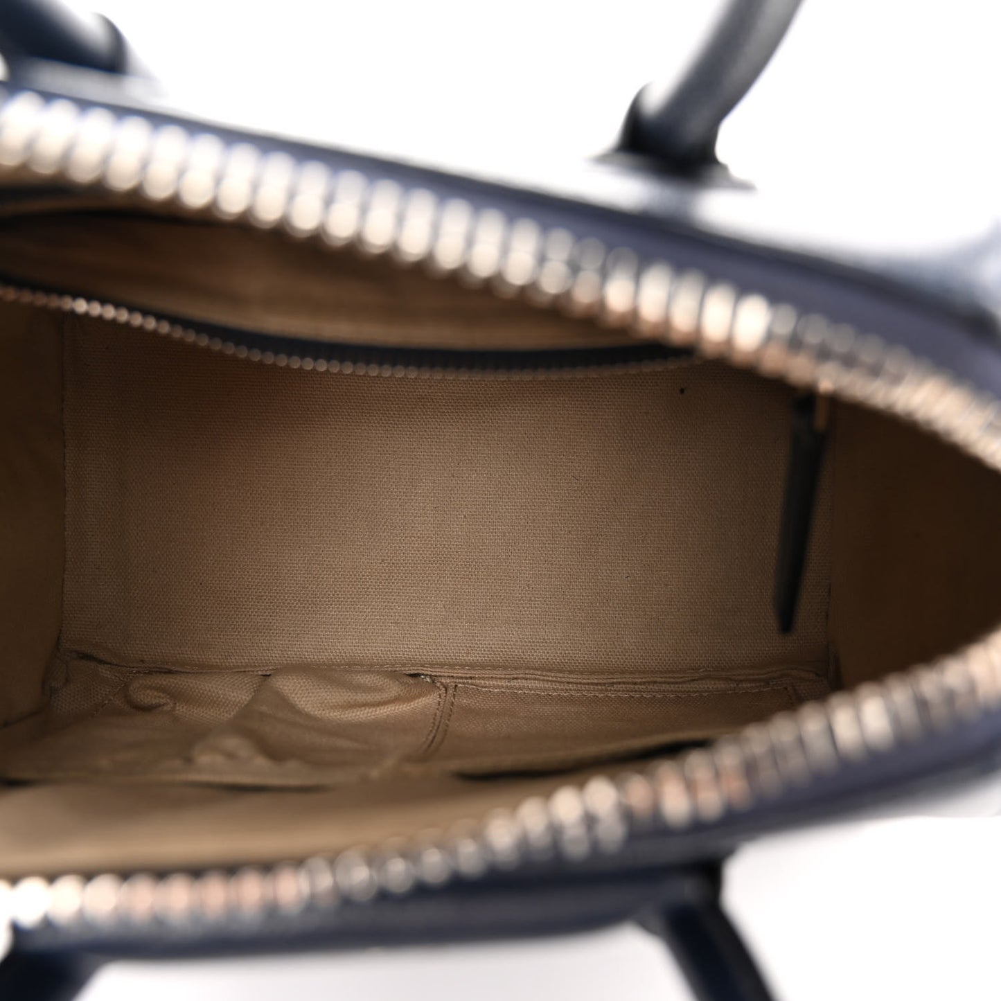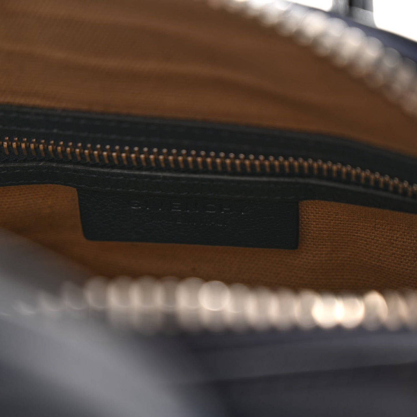 This is an authentic GIVENCHY Sugar Goatskin Mini Antigona in Navy. This elegant shoulder bag is composed of luxuriously grained goatskin leather in navy blue. This cross body bag features rolled leather top handles and an optional adjustable leather shoulder strap with silver studs with polished silver hardware. The top opens with a silver zipper to a beige fabric interior with zipper and patch pockets.