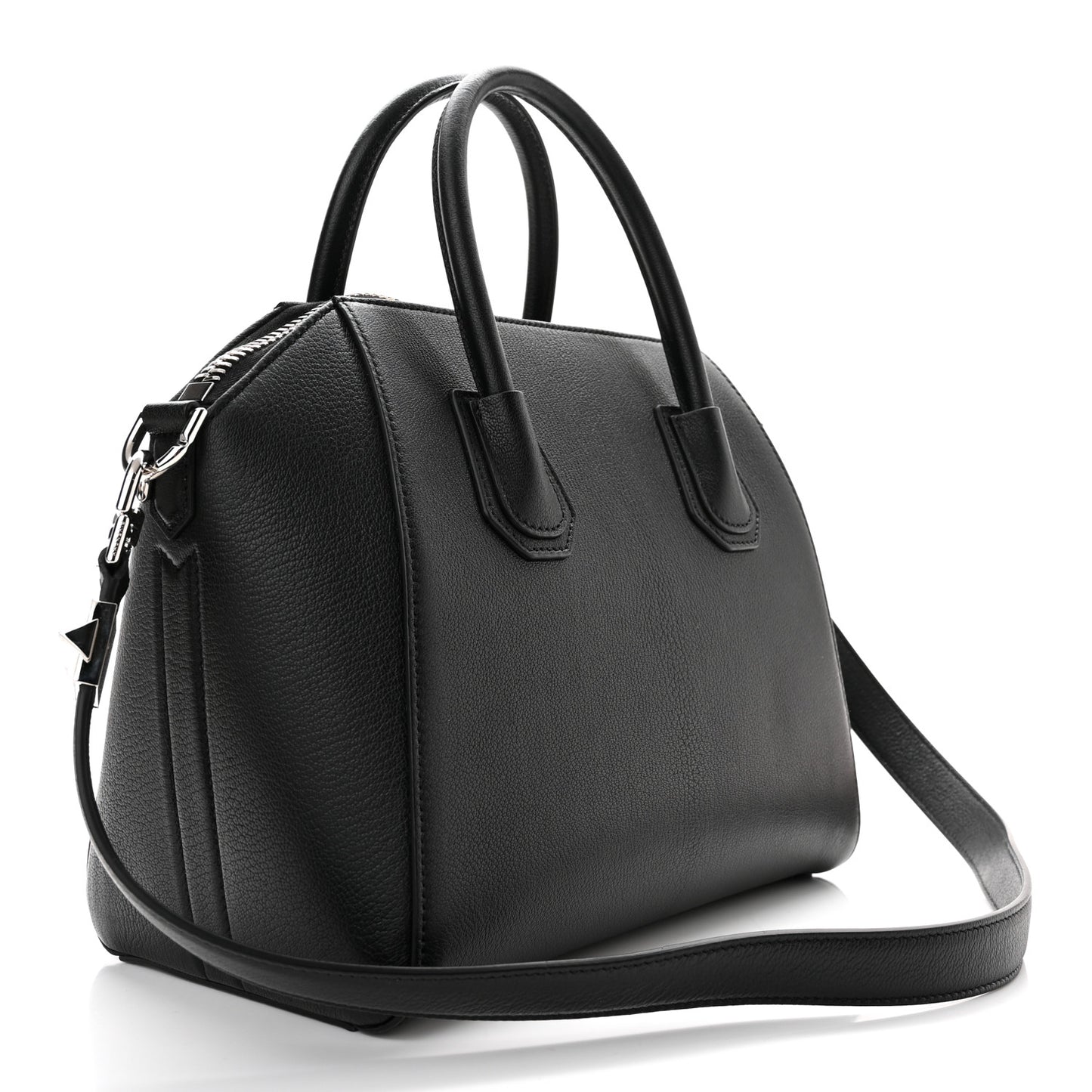 This is an authentic GIVENCHY Sugar Goatskin Small Antigona in Black. This elegant bag is crafted of luxuriously grained goatskin leather in black. The shoulder bag features rolled leather top handles, an optional leather shoulder strap, and polished silver hardware. The top zipper opens to a black fabric interior with zipper and patch pockets.