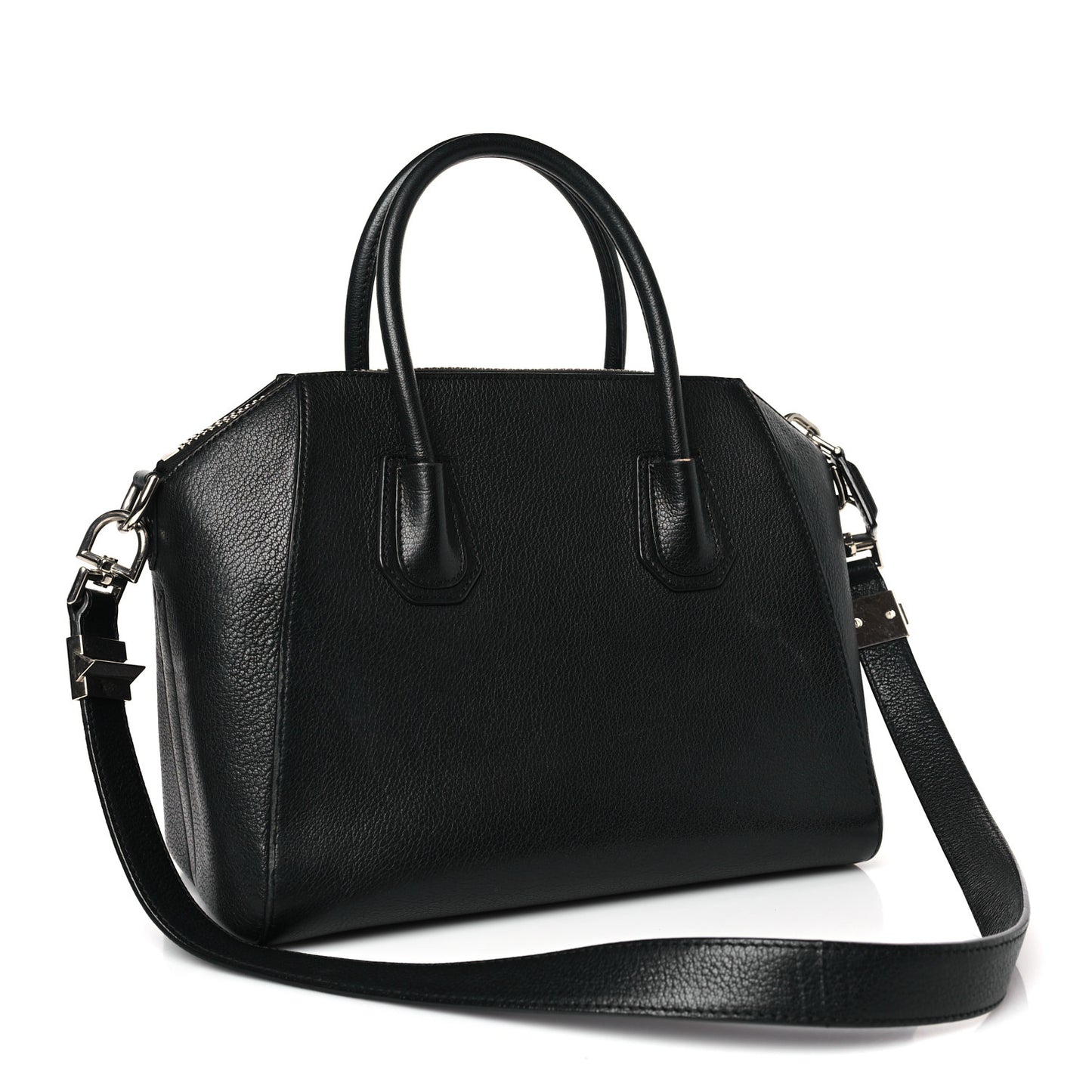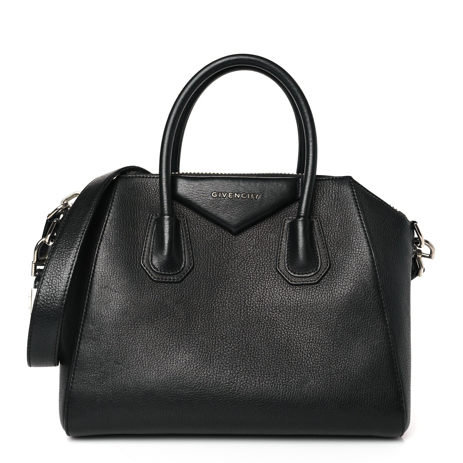 This is an authentic GIVENCHY Sugar Goatskin Small Antigona in Black. This elegant tote is crafted of luxuriously textured goatskin leather in black. The bag features rolled leather top handles, an attached shoulder strap with polished silver hardware, and signature expansive sides panels. The top zipper opens the bag to a black fabric interior with zipper and patch pockets.