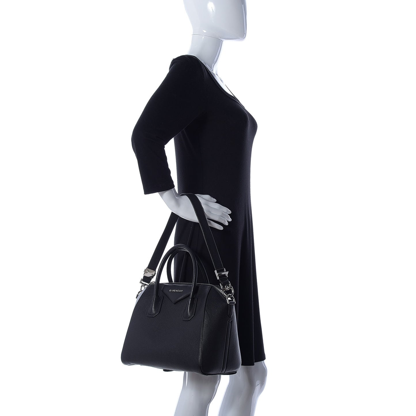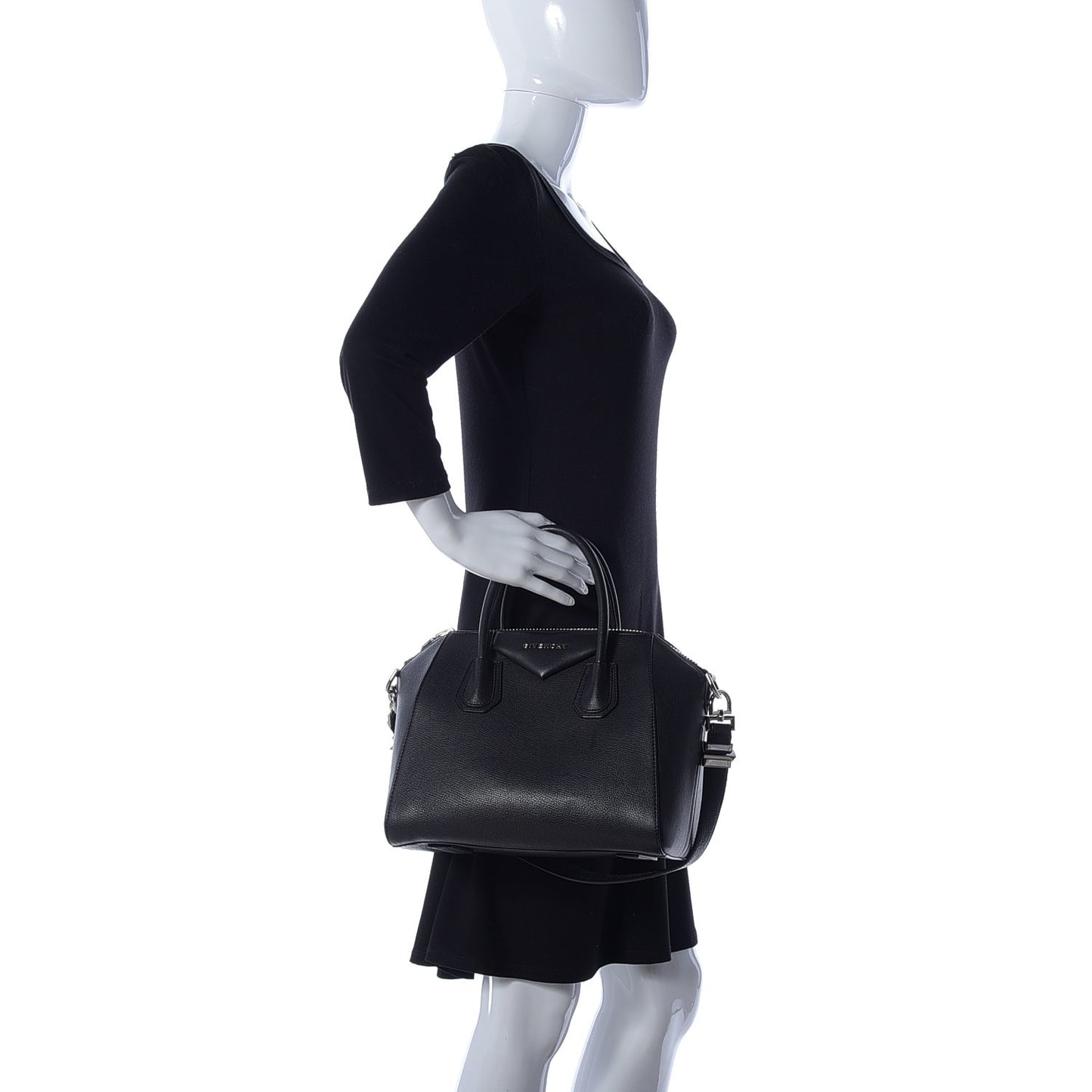 This is an authentic GIVENCHY Sugar Goatskin Small Antigona in Black. This elegant tote is crafted of luxuriously textured goatskin leather in black. The handbag features rolled leather top handles, a flat leather shoulder strap, and signature structured expansive sides. The top opens with a polished silver zipper to a black fabric interior with zipper and patch pockets.