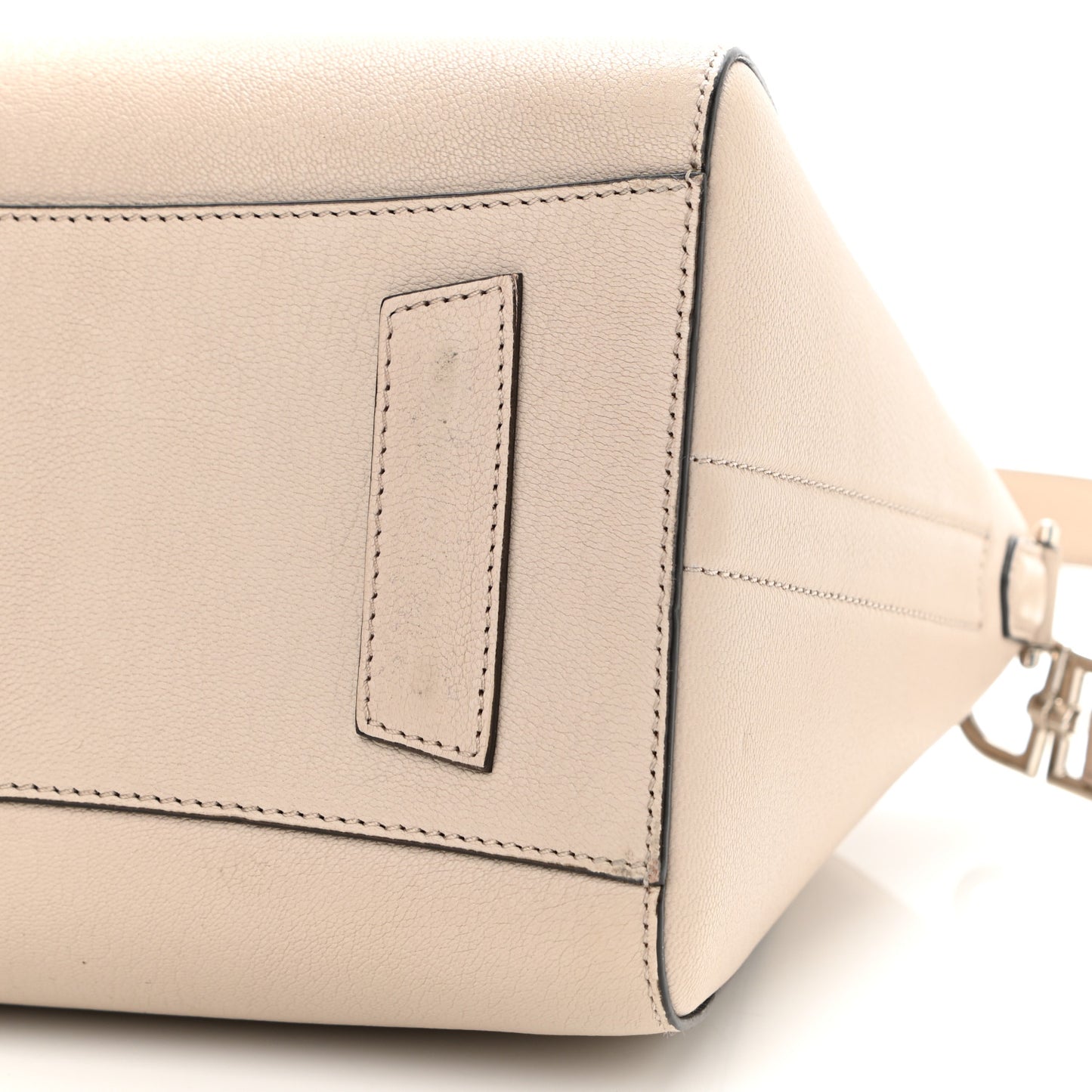 This is an authentic GIVENCHY Sugar Goatskin Small Antigona in Dune. This elegant model is composed of luxuriously grained goatskin leather in light beige. The bag features rolled-leather top handles and an optional leather shoulder strap with polished silver hardware. The top zipper opens to a beige fabric interior with zipper and patch pockets.