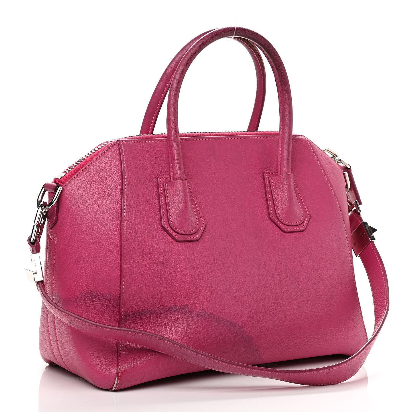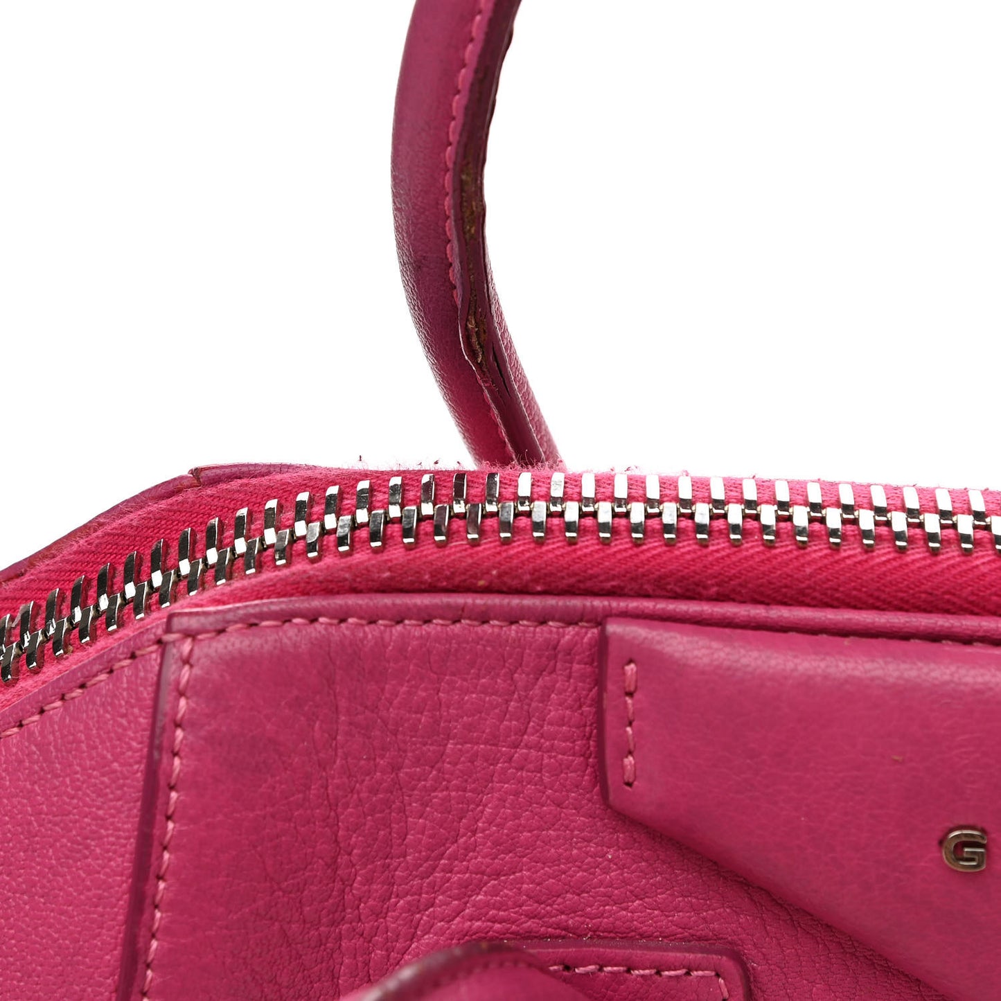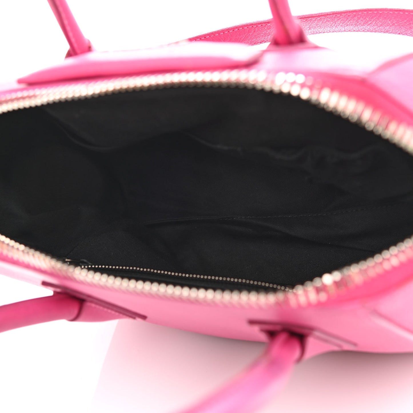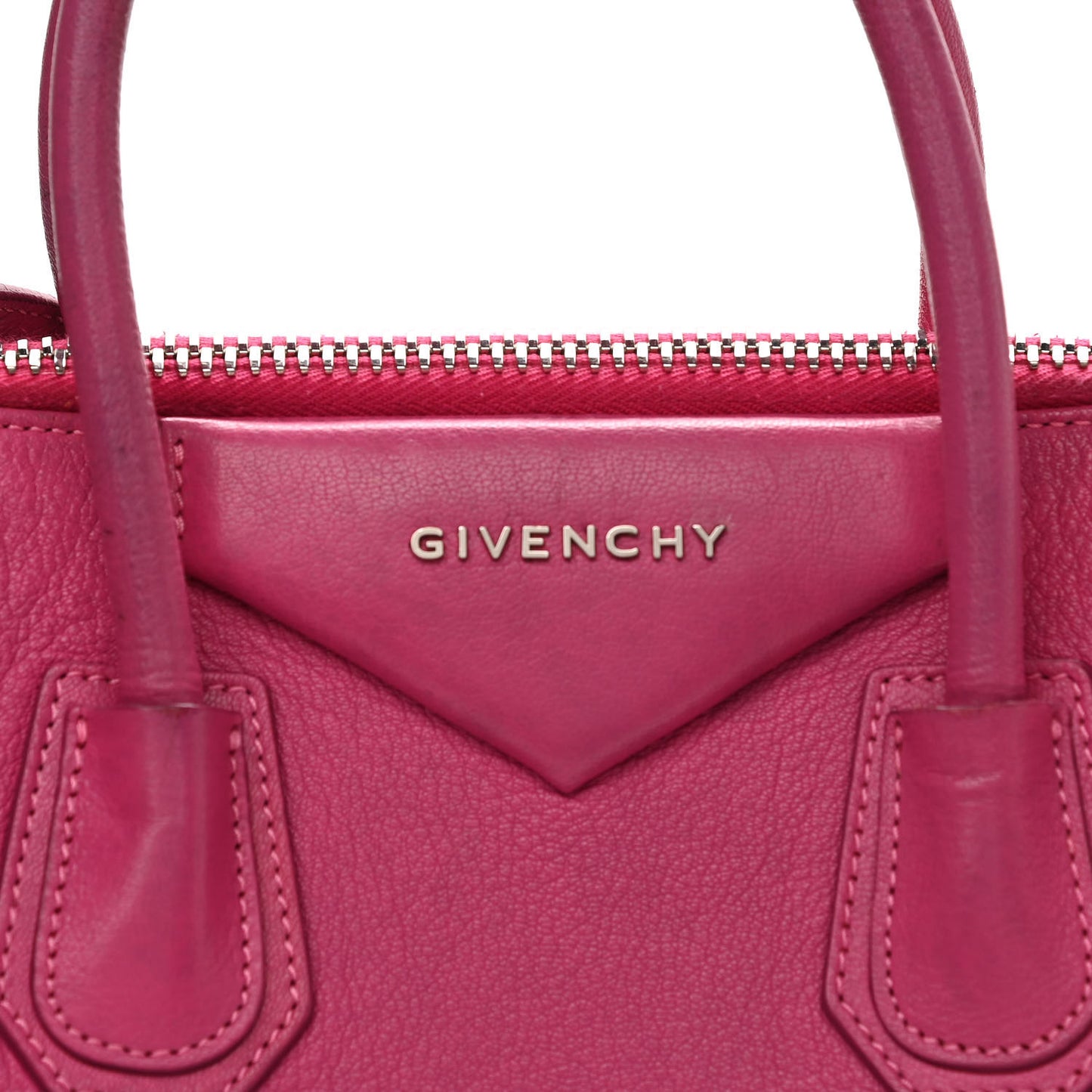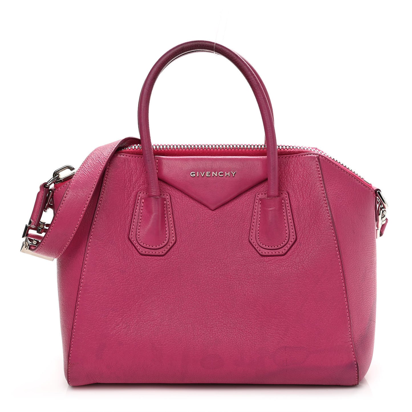 This is an authentic GIVENCHY Sugar Goatskin Small Antigona in Fuchsia. This elegant model is crafted of luxurious grained goatskin leather in deep pink. It features rolled leather top handles and a leather shoulder strap with polished silver hardware. The top opens with a zipper to a black fabric interior with zipper and patch pockets.Follow this item for alerts. Givenchy is a registered trademark of Givenchy. FASHIONPHILE is not affiliated with Givenchy.