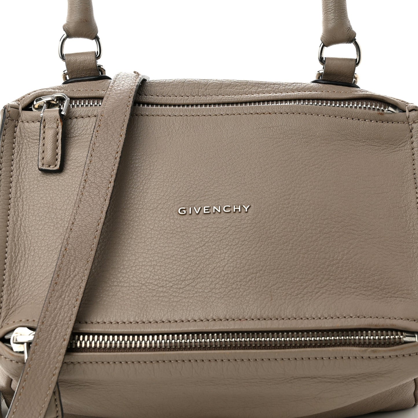 This is an authentic GIVENCHY Sugar Goatskin Small Pandora in Mastic. This chic messenger bag is finely crafted of sugar-grained goatskin leather in taupe. The bag features two external frontal zipper pockets, a rolled leather handle, and an optional leather body strap with silver hardware. The top wrap opens to a fabric interior with zipper and patch pockets.Follow this item for alerts. Givenchy is a registered trademark of Givenchy. FASHIONPHILE is not affiliated with Givenchy.