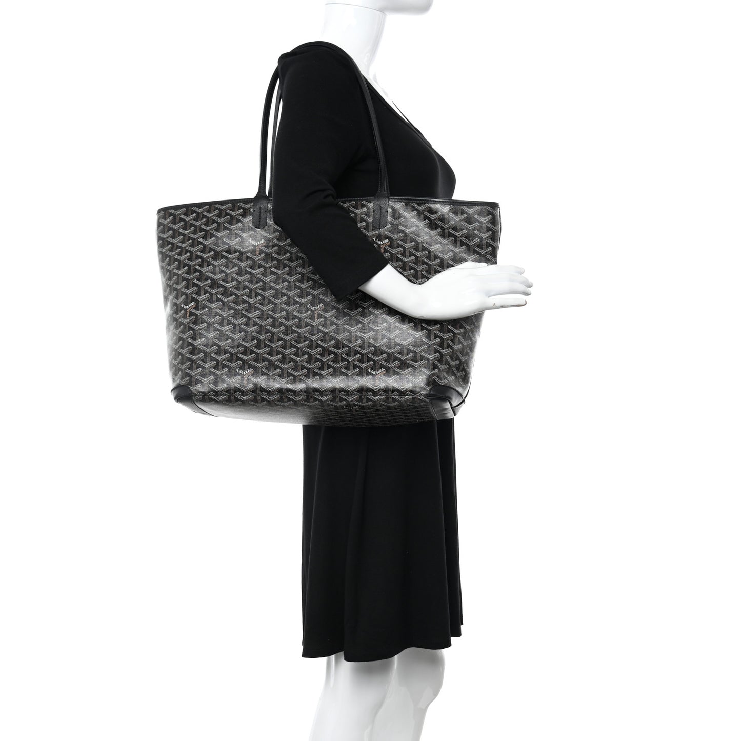 This is an authentic GOYARD Goyardine Artois MM in Black. This is a tote crafted of Goyardine coated canvas with its iconic chevron pattern. This tote features black leather trim, leather strap handles, and leather corner patches. The silver top zipper opens to a spacious ivory canvas interior with a hanging patch pocket lined with matching goyardine coated canvas.