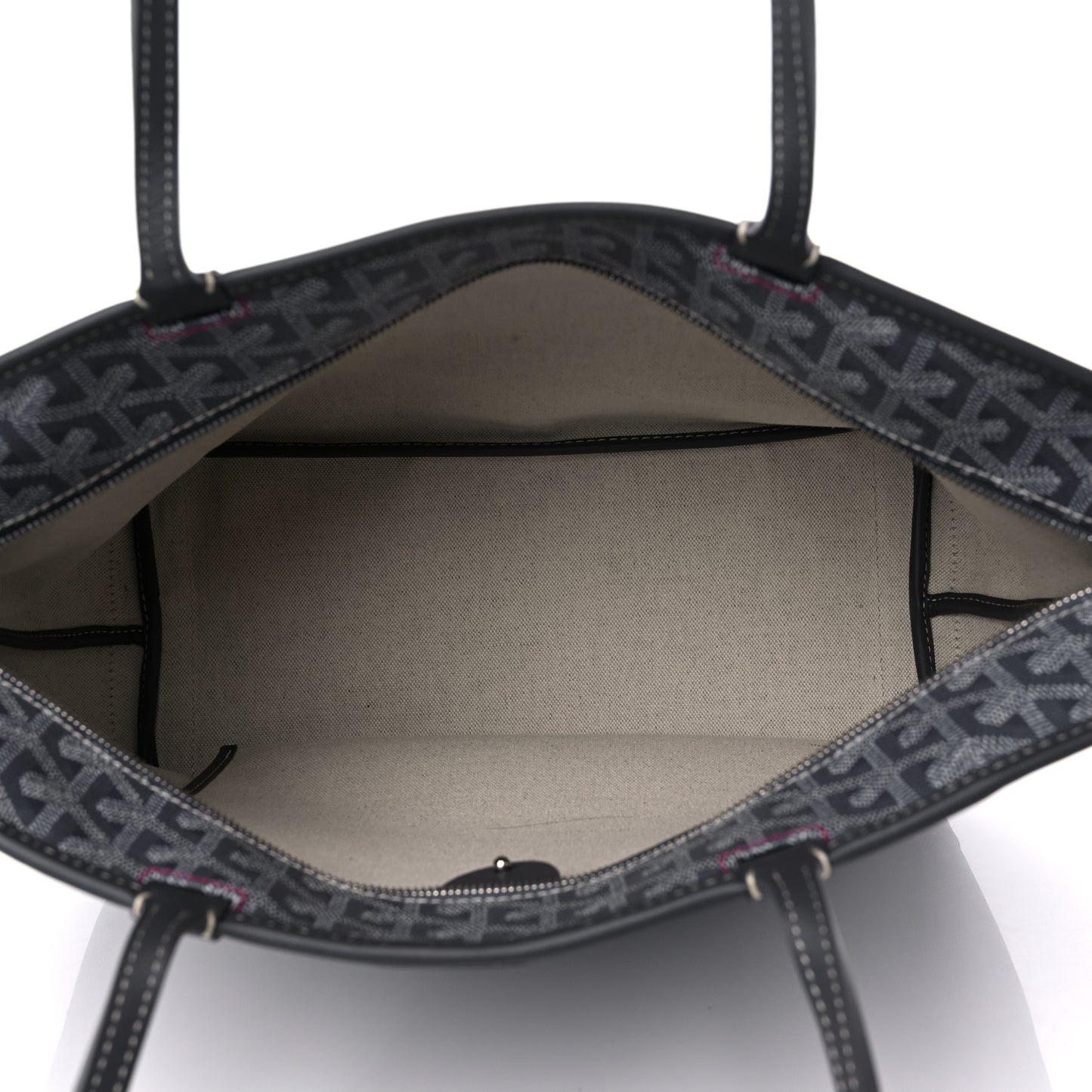 This is an authentic GOYARD Goyardine Artois PM in Grey. This is a tote crafted of Goyardine coated canvas with its iconic chevron pattern. This tote features gray leather trim, leather strap handles, and leather corner patches. The silver top zipper opens to a spacious ivory canvas interior with a hanging patch pocket lined with matching goyardine coated canvas. The bag is hot stamped with initials "JVH"Follow this item for alerts. Goyard is a registered trademark of Goyard. FASHIONPHILE is not affiliated with Goyard.