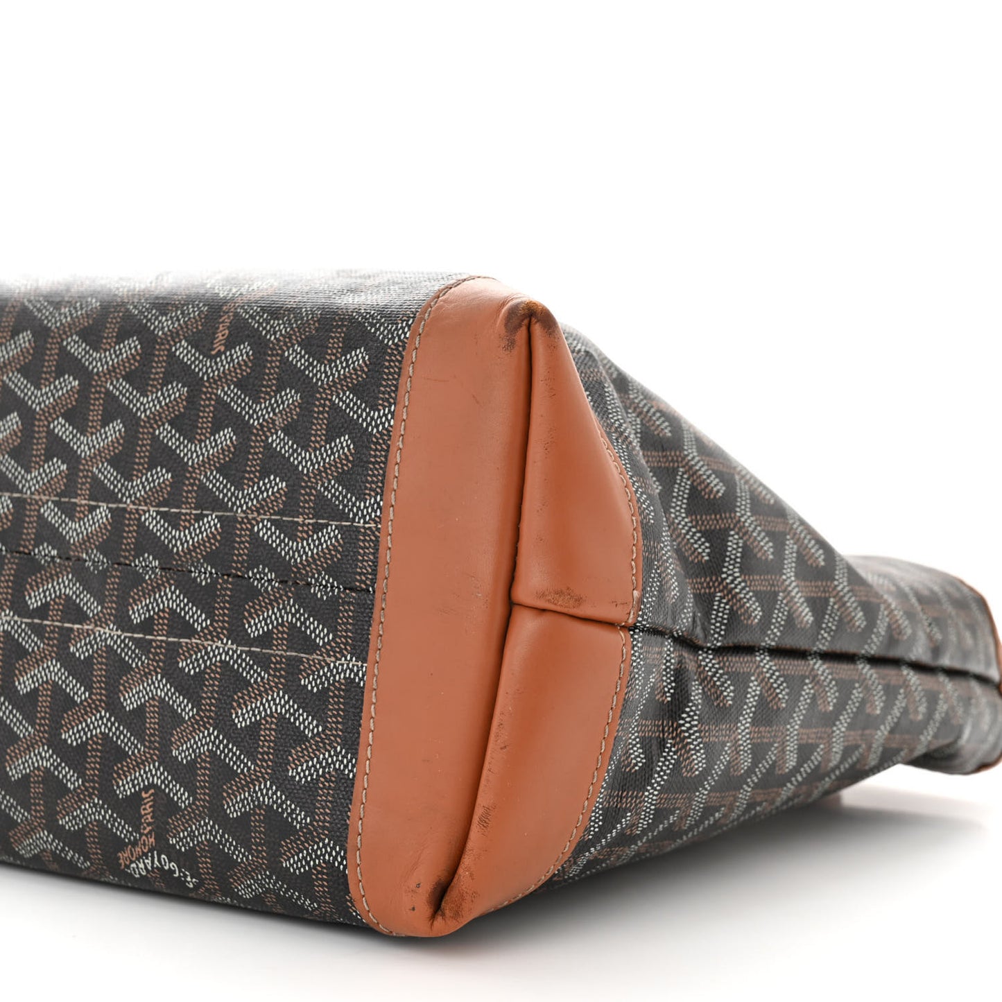 This is an authentic GOYARD Goyardine Bellechasse PM in Black and Gold. This tote is crafted of traditional Goyard chevron coated canvas and leather. The bag features brown rolled leather strap top handles with a top crest, brown leather trim, silver hardware and a yellow and white hot stamped stripe. The top is open to a natural fabric interior with a hanging pocket.Follow this item for alerts. Goyard is a registered trademark of Goyard. FASHIONPHILE is not affiliated with Goyard.