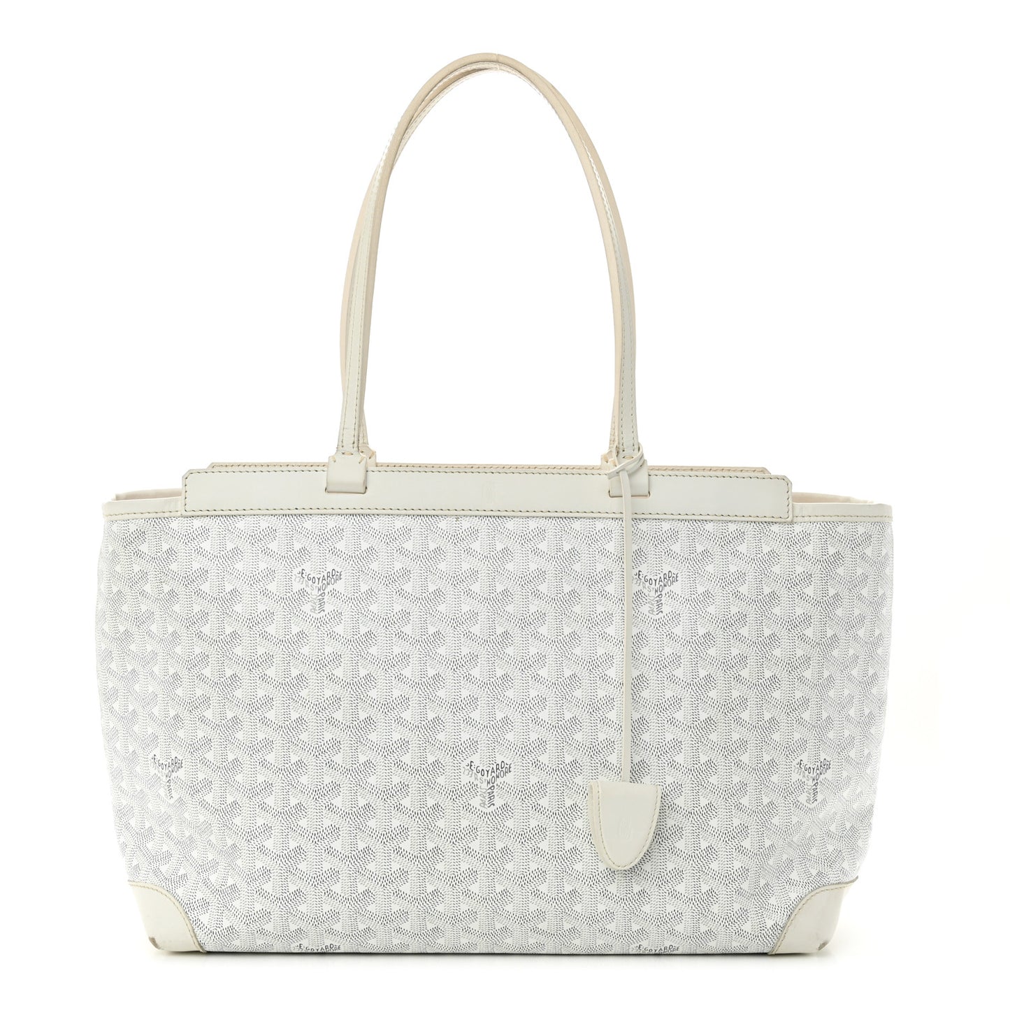 This is an authentic GOYARD Goyardine Bellechasse PM in White. This stylish tote is luxuriously crafted of Goyard canvas with the classic Goyard chevron monogram in white. It features sturdy white leather top handles and leather trim and polished silver hardware. The top opens to a spacious canvas interior with a hanging patch pocket and removable base.