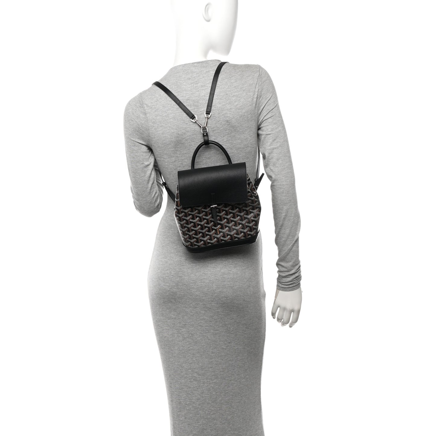 This is an authentic GOYARD Goyardine Calfskin Mini Alpin Backpack in Black. This versatile backpack is crafted of calfskin leather and Goyard Goyardine coated canvas in black. It features a structured and sturdy flat bottom, black leather straps with silver links that can be used as backpack straps or shoulder straps, and a cinch cord top covered by a front flap. This opens to a beige fabric interior with a patch pocket.Follow this item for alerts. Goyard is a registered trademark of Goyard. FASHIONPHILE is not affiliated with Goyard.
