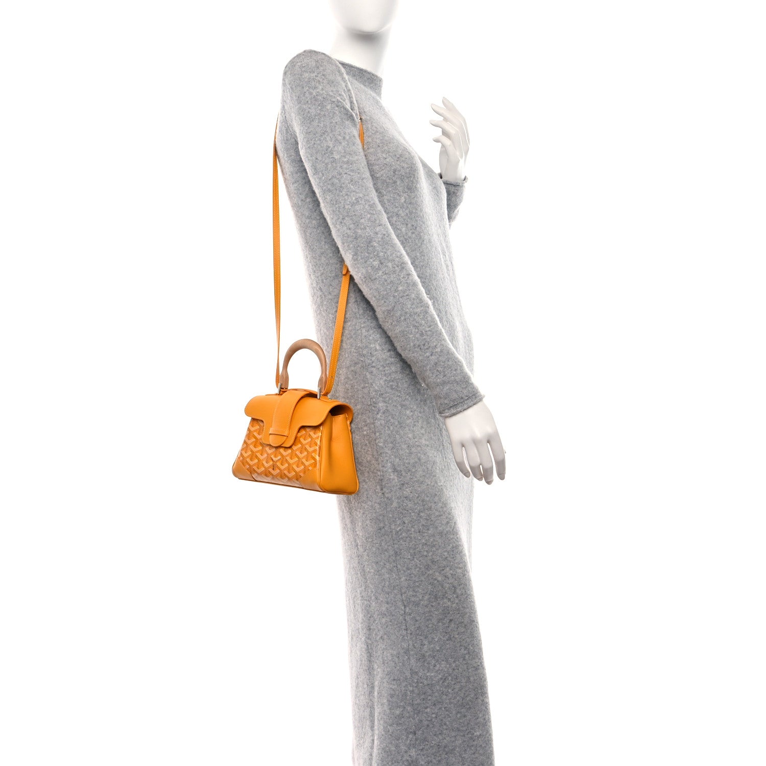 This is an authentic GOYARD Goyardine Mini Saigon in Yellow. This stylish travel case is crafted of yellow coated canvas with the classic Goyard chevron design. The bag features a wooden handle, an optional leather shoulder strap, and leather trim. The crossover flap opens to a lemon yellow leather interior with a flat pocket.Follow this item for alerts. Goyard is a registered trademark of Goyard. FASHIONPHILE is not affiliated with Goyard.
