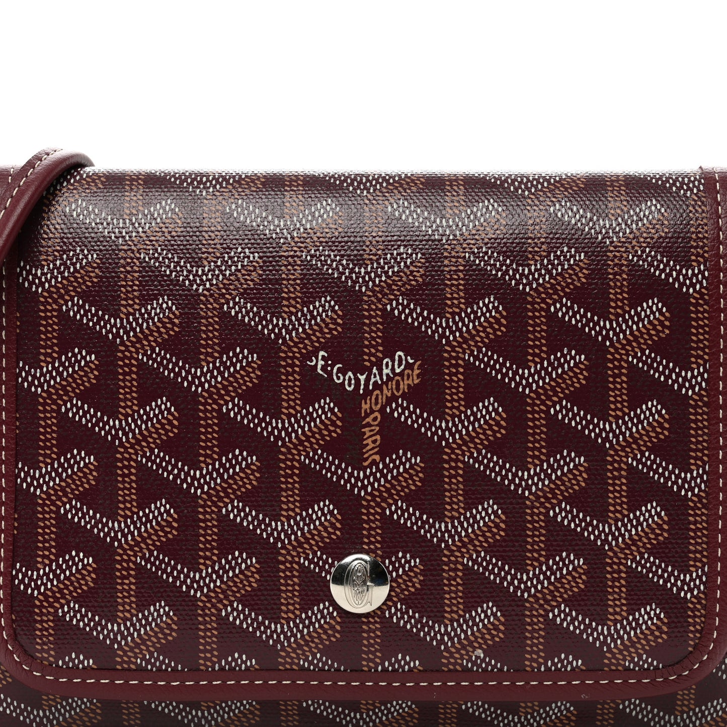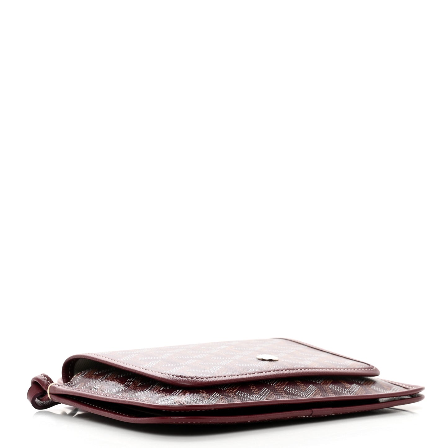 This is an authentic GOYARD Goyardine Plumet Wallet Clutch in Burgundy. This stylish shoulder bag is crafted of classic Goyard chevron monogram on burgundy coated canvas, with leather trim, and an optional shoulder strap. The crossover flap snaps open to a partitioned beige fabric interior with a zipper compartment, and leather patch pockets.Follow this item for alerts. Goyard is a registered trademark of Goyard. FASHIONPHILE is not affiliated with Goyard.
