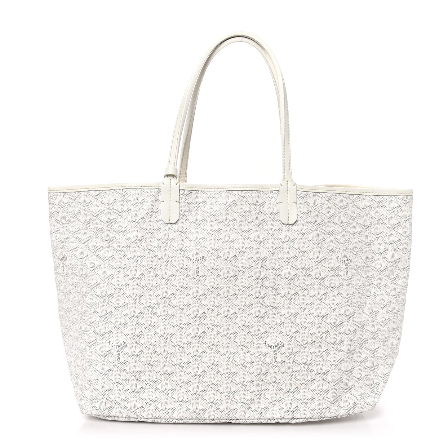 This is an authentic GOYARD Goyardine Saint Louis PM in White. This tote is crafted of Goyard chevron white canvas. The bag has a white leather trim along the top and white leather handles. The top is open to a beige canvas interior with a matching removable pouch.Follow this item for alerts. Goyard is a registered trademark of Goyard. FASHIONPHILE is not affiliated with Goyard.