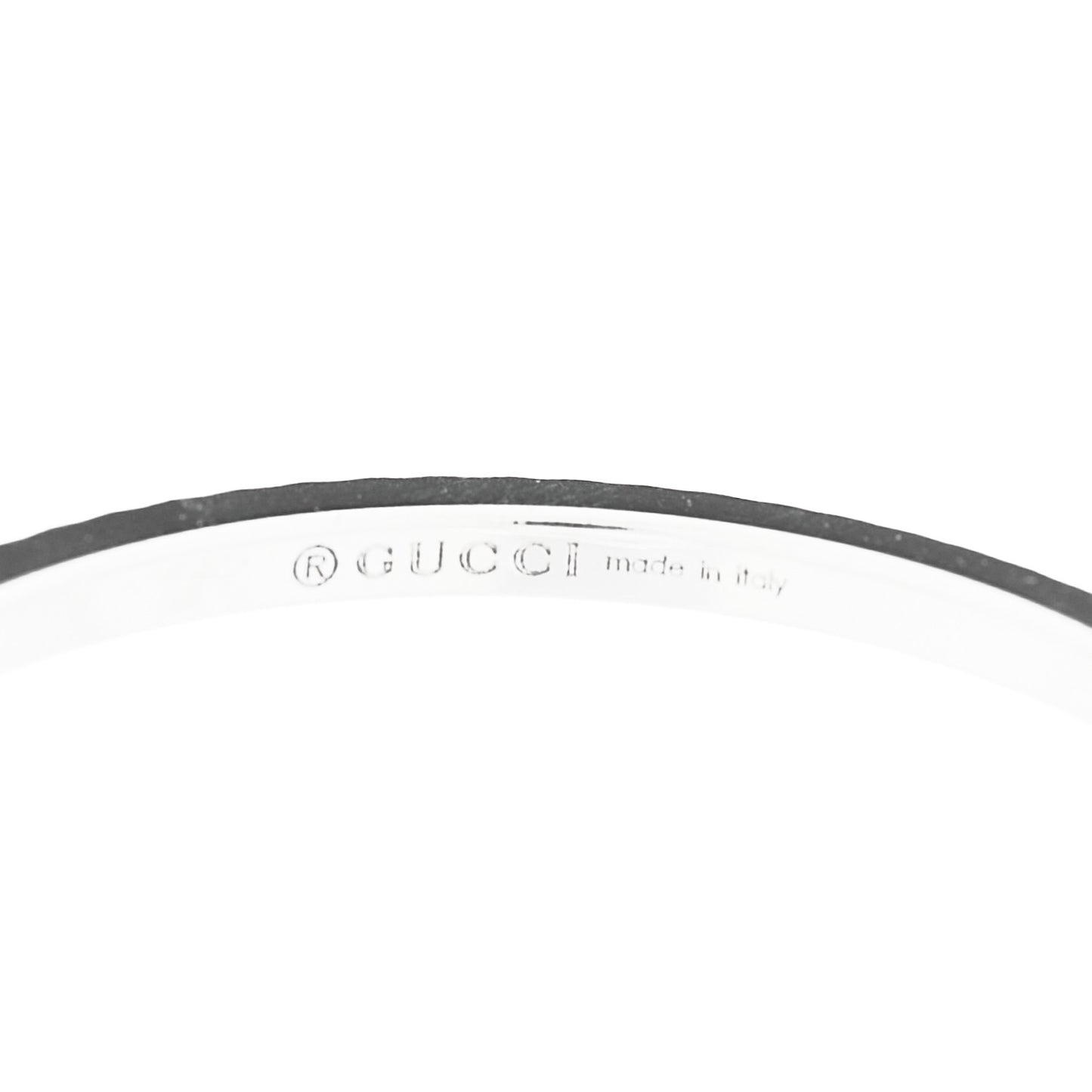 This is an authentic GUCCI 18K White Gold Diamond Running G Charm Ring size 53 or 6.5. The ring is crafted of 18 karat white gold and features a narrow textured band and the signature running G motif charm set with pave diamonds, approximately .08 total carat weight. PLEASE NOTE: The GG charm is slightly bent at the bail.Follow this item for alerts. Gucci is a registered trademark of Gucci. FASHIONPHILE is not affiliated with Gucci.