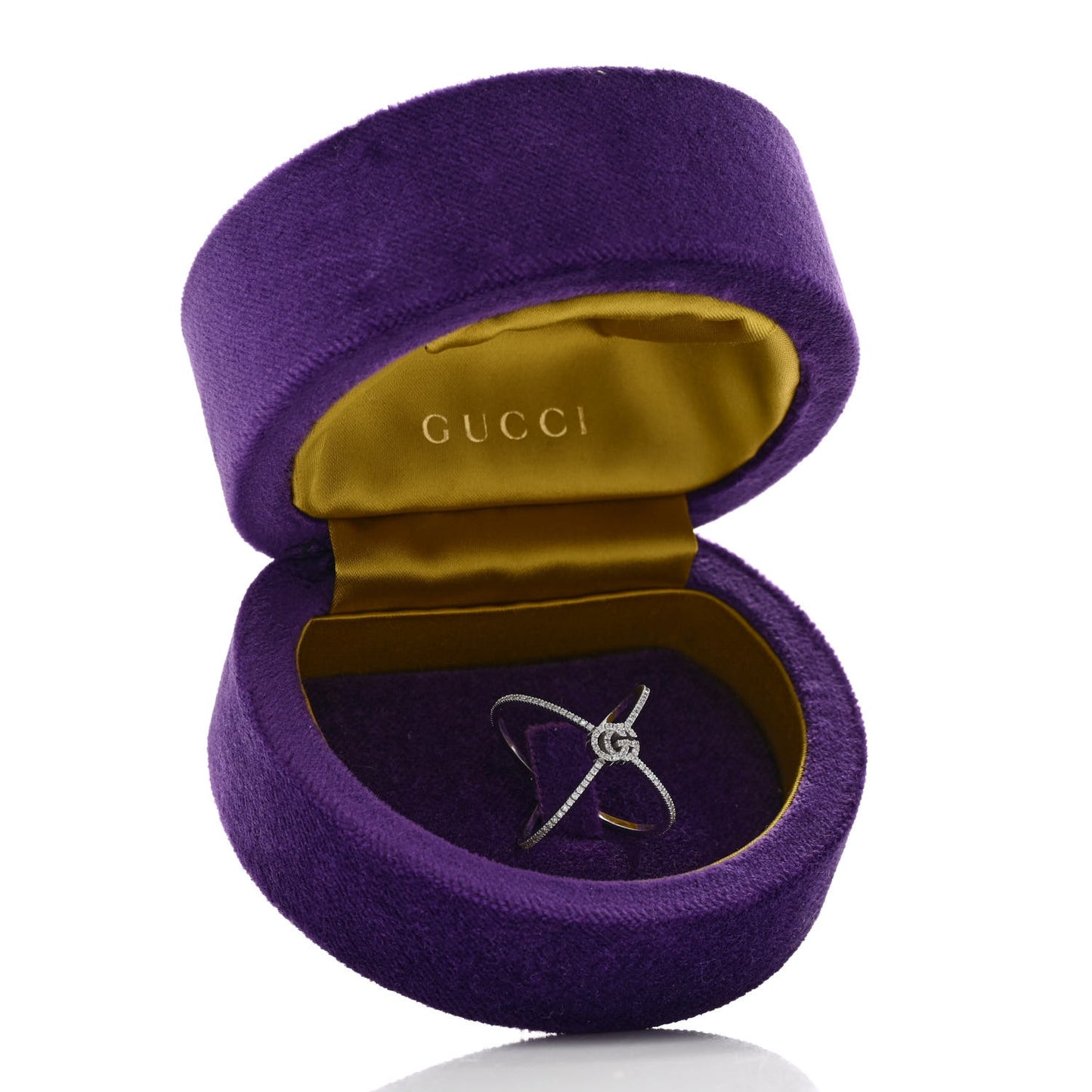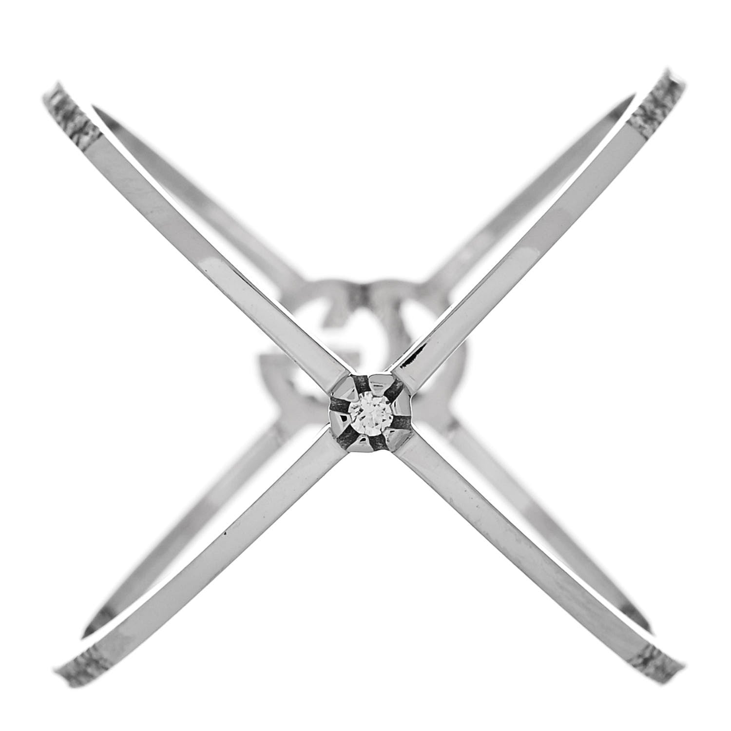 This is an authentic GUCCI 18K White Gold Diamond Running G Cross Ring size 58 or 8.25. This ring is elegantly crafted of 18 karat white gold in an open style criss cross motif accented with diamonds, it features a small Gucci GG logo at the center intersection, and is finished with one diamond accent on the under side intersection, approximately .30 total diamond carat weight for the entire ring.