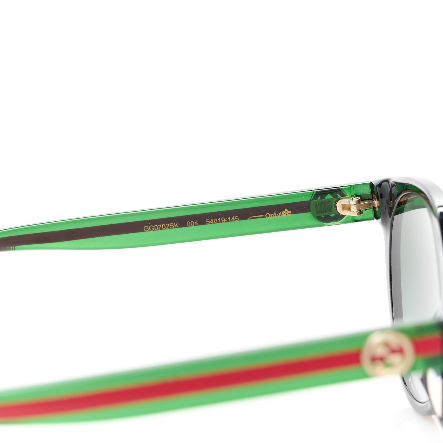 This is an authentic pair of GUCCI Acetate Round Web Sunglasses GG0702S in Black. These frames are black with oversized round rims with lenses in gradient dark grey. The arms feature a green and red web stripe with a gold Gucci interlocking G logo.Follow this item for alerts. Gucci is a registered trademark of Gucci. FASHIONPHILE is not affiliated with Gucci.