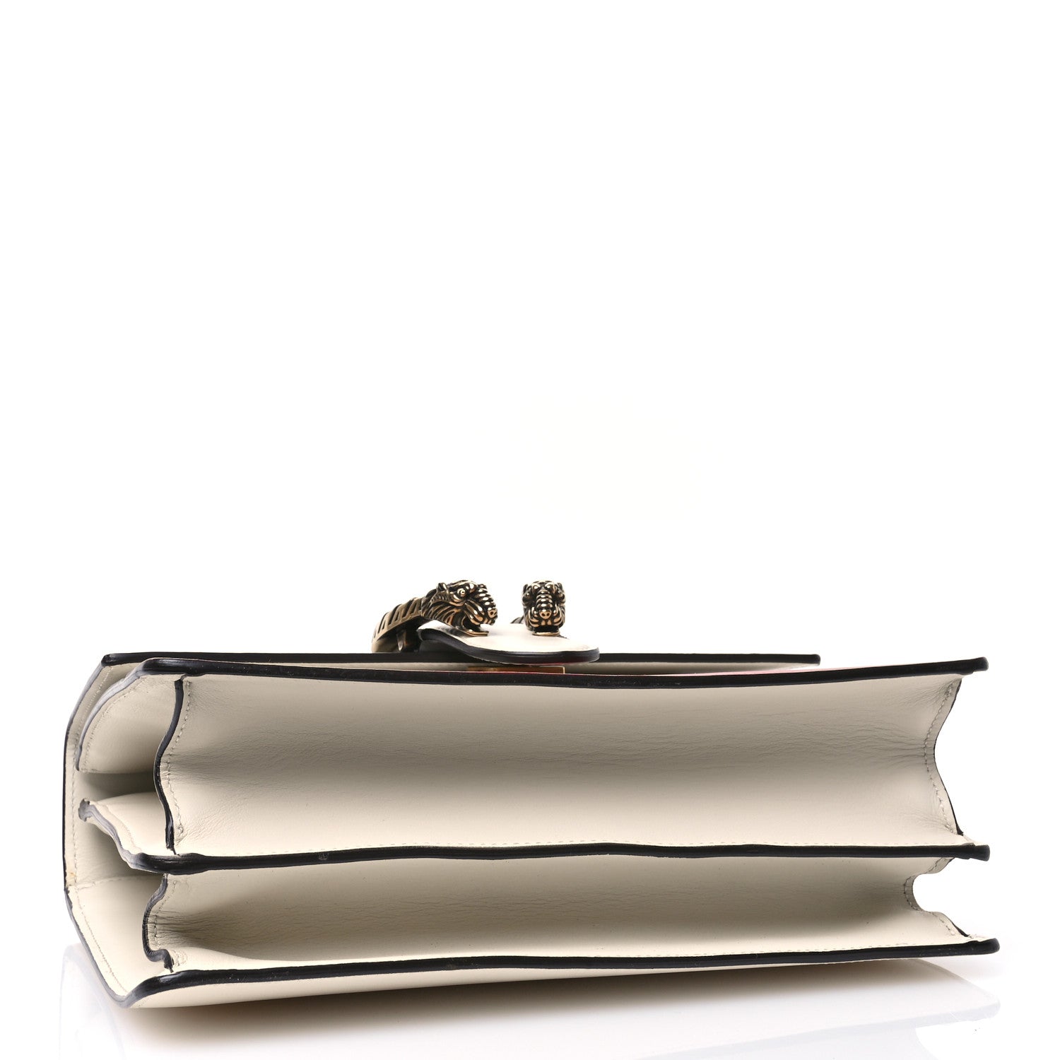This is an authentic GUCCI Calfskin Bamboo Web Medium Dionysus Top Handle Bag in White, Blue and Hibiscus Red. This exquisite, one-of-a kind bag is crafted of smooth white calfskin leather with a blue and red stripes across the front. The bag has a sturdy bamboo top handle, an optional web nylon shoulder strap, and a prominent brass tiger head horseshoe closure. The flap opens to reveal a partitioned beige fabric interior with patch pockets and a central dividing zipper compartment.Follow this item for alerts. Gucci is a registered trademark of Gucci. FASHIONPHILE is not affiliated with Gucci.