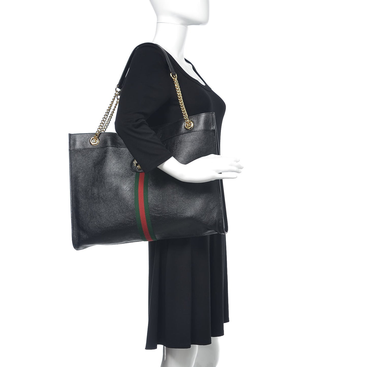 This is an authentic GUCCI Calfskin Large Rajah Chain Tote in Black. This shoulder bag is finely crafted of black calfskin leather. It features a prominent crystal tiger head stud on the front, red and green web striping, and gold chain-link shoulder straps with black leather shoulder pads. The top is open to a nude suede leather interior with a matching removable pouch.Follow this item for alerts. Gucci is a registered trademark of Gucci. FASHIONPHILE is not affiliated with Gucci.