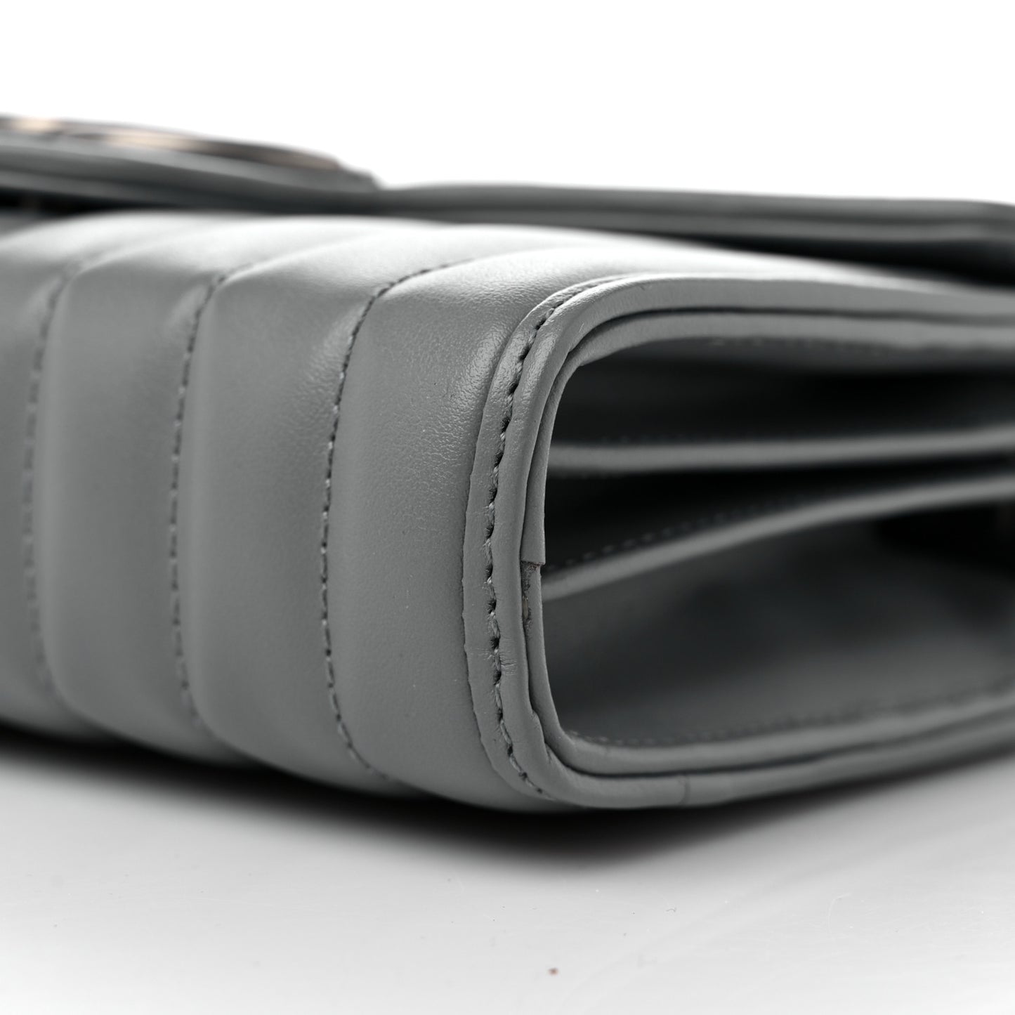 This is an authentic GUCCI Calfskin Matelasse Aria GG Marmont Chain Wallet in Deep Grey. This shoulder bag is made of soft chevron quilted calfskin leather in grey. It features an optional aged silver chain-link shoulder strap and a crossover flap with an interlocking aged gold GG logo. This opens to a partitioned black fabric and grey leather interior with a zipper compartment, patch pockets, and card slots.Follow this item for alerts. Gucci is a registered trademark of Gucci. FASHIONPHILE is not affiliated with Gucci.