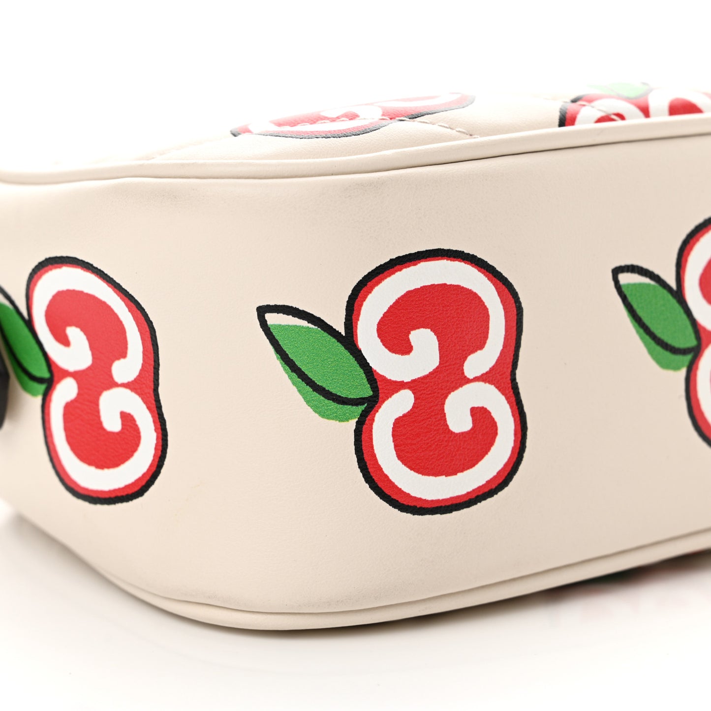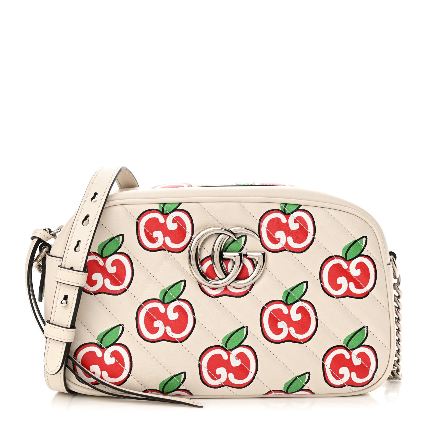 This is an authentic GUCCI Calfskin Matelasse Diagonal Small GG Apple Marmont Chain Shoulder Bag in Ivory. This shoulder bag is crafted of smooth and supple calfskin leather in beige with red and green fruit motif. This bag features a long silver chain and leather shoulder strap. The front crossover flap features an interlocking GG logo that opens to a beige microfiber interior with a zipper pocket.Follow this item for alerts. Gucci is a registered trademark of Gucci. FASHIONPHILE is not affiliated with Gucci.